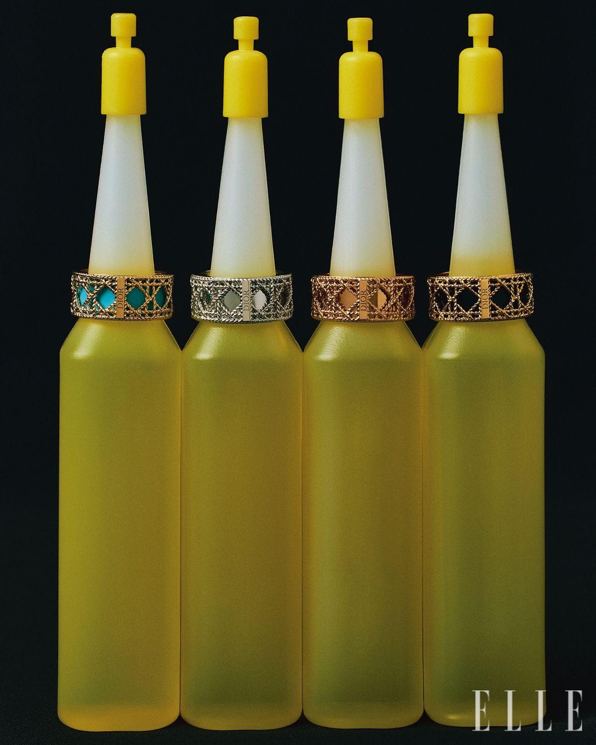 옐로골드와 터쿠아즈 래커 디테일의 마이 디올 링과 화이트골드 마이 디올 링, 핑크골드 마이 디올 링 그리고 옐로골드에 블랙 래커 디테일의 마이 디올 링은 모두 Dior Joaillerie.