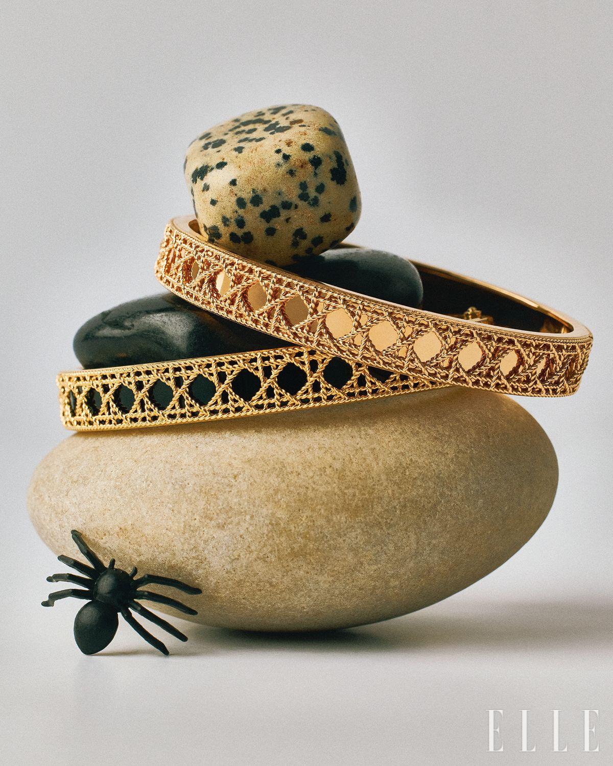 (위부터) 까나쥬 패턴이 돋보이는 핑크골드 마이 디올 브레이슬릿과 옐로골드에 블랙 래커로 마감한 마이 디올 브레이슬릿은 모두 Dior Joaillerie.