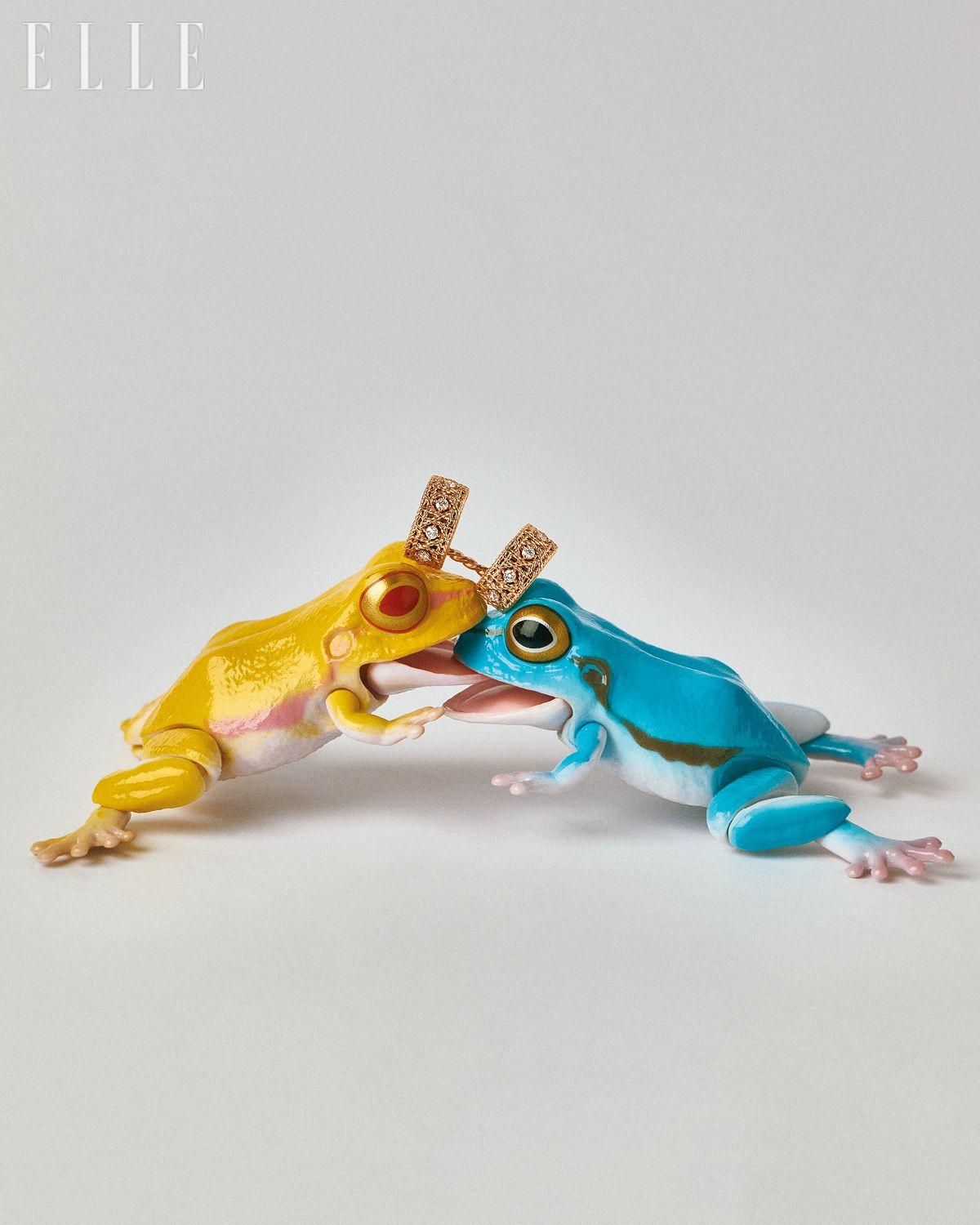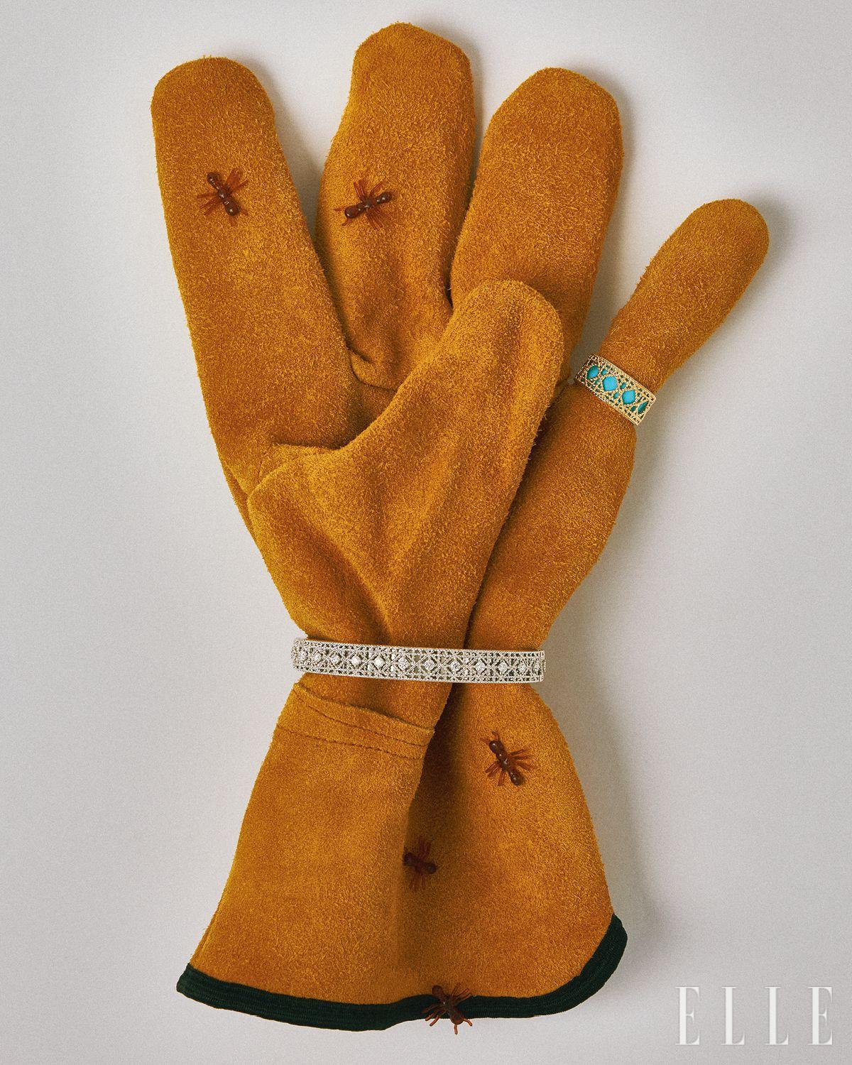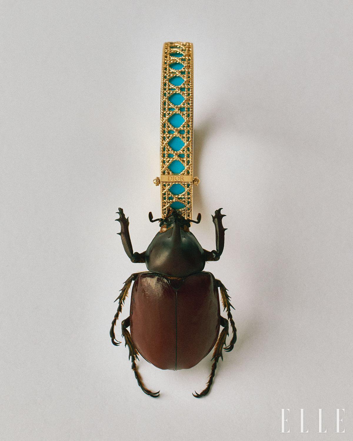 옐로골드와 터쿠아즈 래커 디테일의 마이 디올 링과 화이트골드에 다이아몬드를 세팅한 마이 디올 브레이슬릿은 모두 Dior Joaillerie.