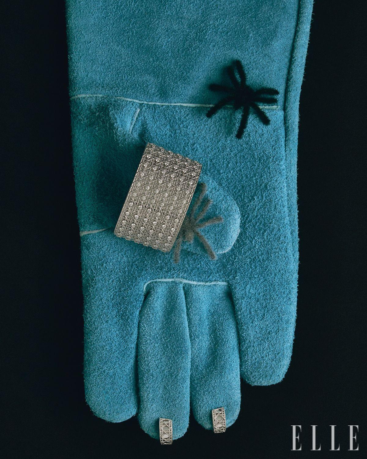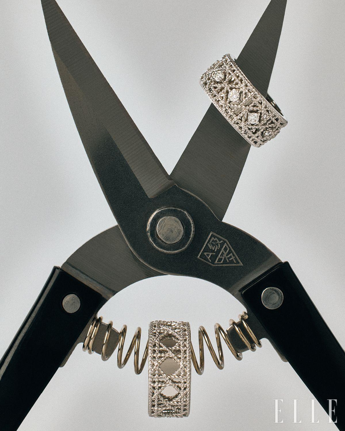까나쥬 패턴이 돋보이는 화이트골드 마이 디올 링과 화이트골드 브레이슬릿은 모두 Dior Joaillerie.