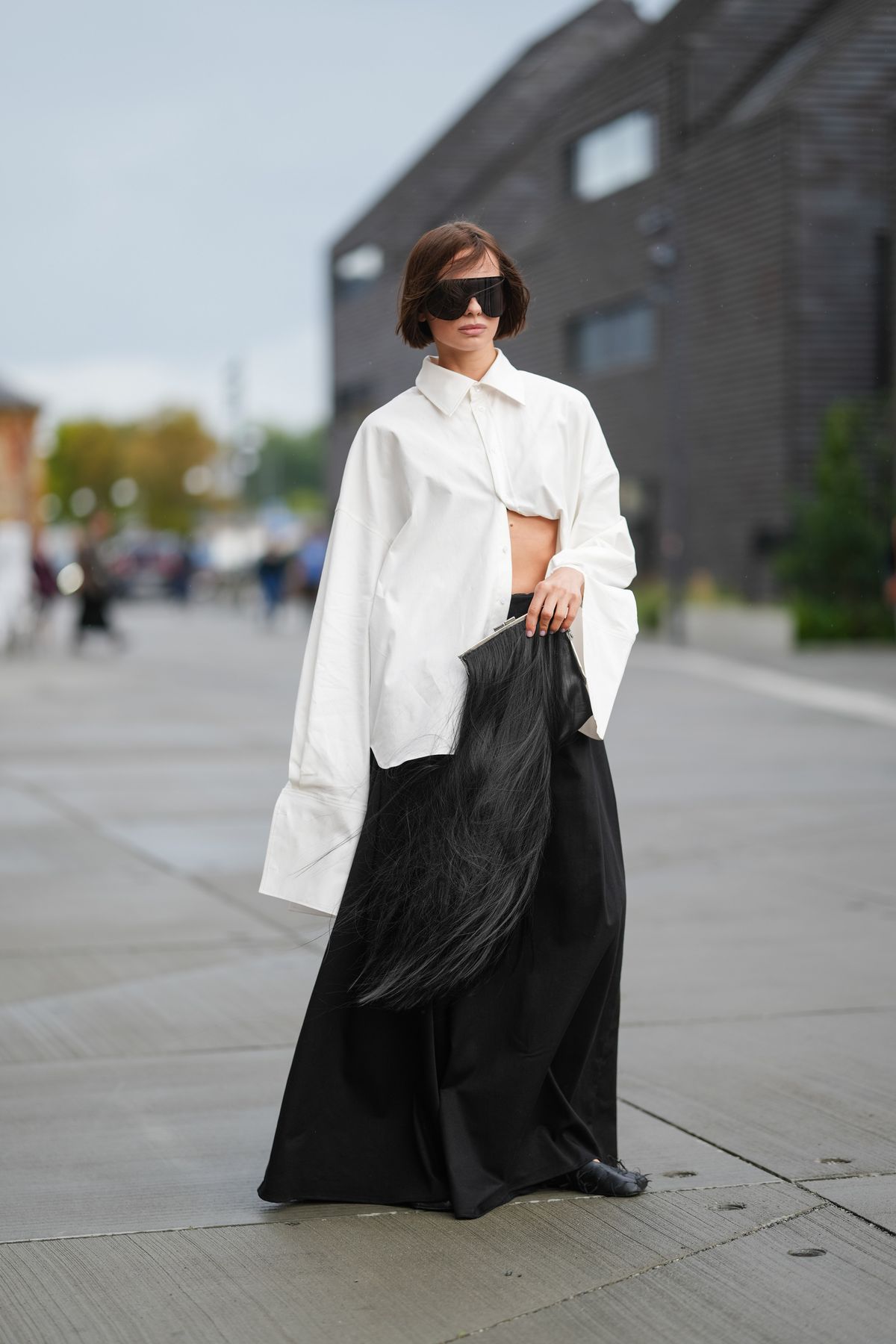 와이드 블랙 롱스커트와 오버사이즈 화이트 셔츠의 대담한 대비라니, 마치 화보의 한 장면 같네요. 셔츠의 언밸런스한 연출과 크롭 노출이 비범한 매력을 만들어냅니다. 과장된 소매와 날카로운 실루엣의 선글라스가 미래적인 기운을 더하기까지 하죠. 블랙 스커트의 유연한 움직임이 모노톤 룩에 드라마틱한 리듬감을 강조하고요. 심플하지만 단호한 애티튜드의 롱 스커트 스타일링이란 이런 거군요!