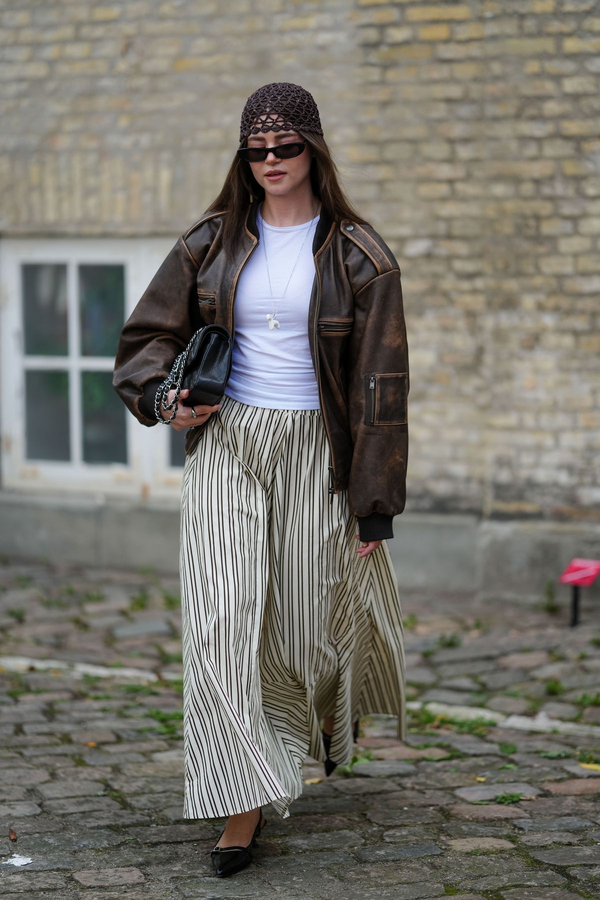 스트라이프 롱스커트에 레더 보머 재킷을 매치하면 더없이 강렬한 무드가 완성됩니다. 치마 특유의 한없이 페미닌한 무드는 온데간데없이요! 화이트 티셔츠가 묵직한 브라운 가죽과 스커트 사이에서 확실한 균형을 맞춰주는군요. 여기에 크로셰 니트 캡과 슬림 선글라스로 보헤미안과 Y2K 감성을 동시에 잡았어요. 발끝은 뾰족한 블랙 슈즈로 마무리해, 전체적으로 기다란 실루엣에 날카로운 포인트를 더했습니다. 오직 스트리트에서만 가능한, 여유와 힘이 동시에 느껴지는 롱스커트 스타일링이에요.