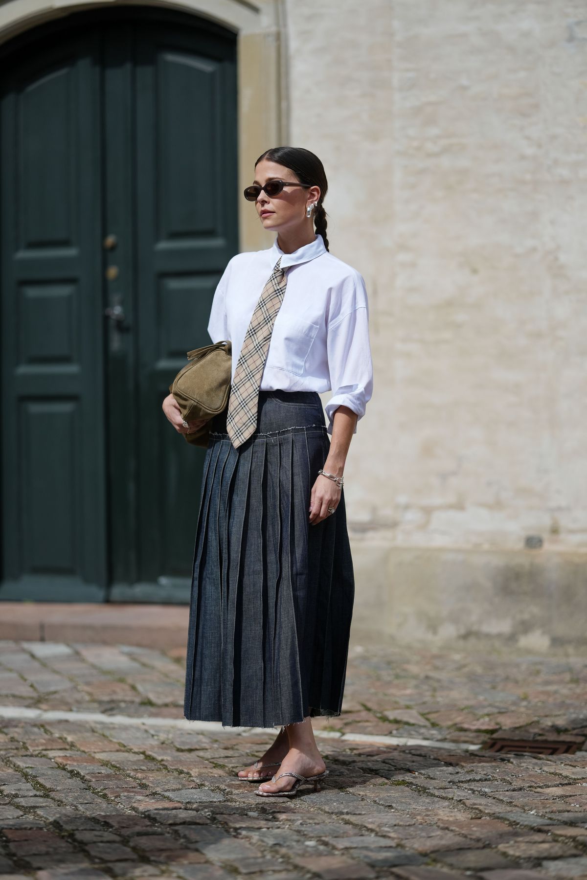 치마는 프레피 무드와도 환상적인 궁합을 자랑합니다. 플리츠 롱스커트에 셔츠와 타이를 매치해, 프레피 무드를 한층 성숙하게 재해석했죠. 소매를 롤업해 연출한 단정한 화이트 셔츠는 룩에 은근한 긴장감을 불어넣고, 타이는 클래식한 디테일을 더하죠. 발끝은 아직은 포기할 수 없는 플립플롭으로 마무리해, 격식과 편안함 사이의 의외성을 자아냈고요. 단정함과 자유로움이 공존하는 롱스커트의 재치 있는 변주네요!