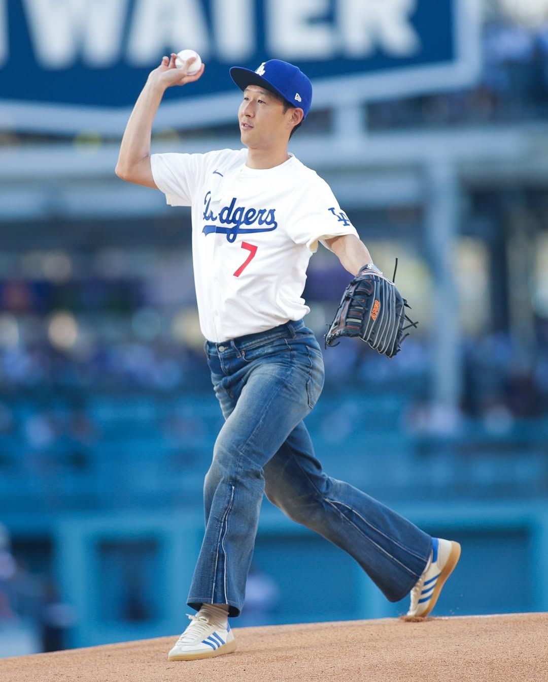 시구 당일 자신의 백 넘버인 '7'이 새겨진 다저스의 유니폼에, 모자와 청바지를 매치한 그는 와인드업을 하기 전 어깨를 들썩거리며 잔망미(?)를 뽐냈습니다. 프리킥 실력 만큼 제구력도 대단했는데요. 오른손으로 던진 공은 깔끔하게 스트라이크존으로 빨려 들어갔습니다. LA다저스는 이를 두고 "완벽한 스트라이크"라고 평하기도 했어요. 이날 같은 소속사이자 LA다저스 선수인 김혜성, 오타니 쇼헤이와의 만남은 성사되지 않은 것으로 전해졌습니다.