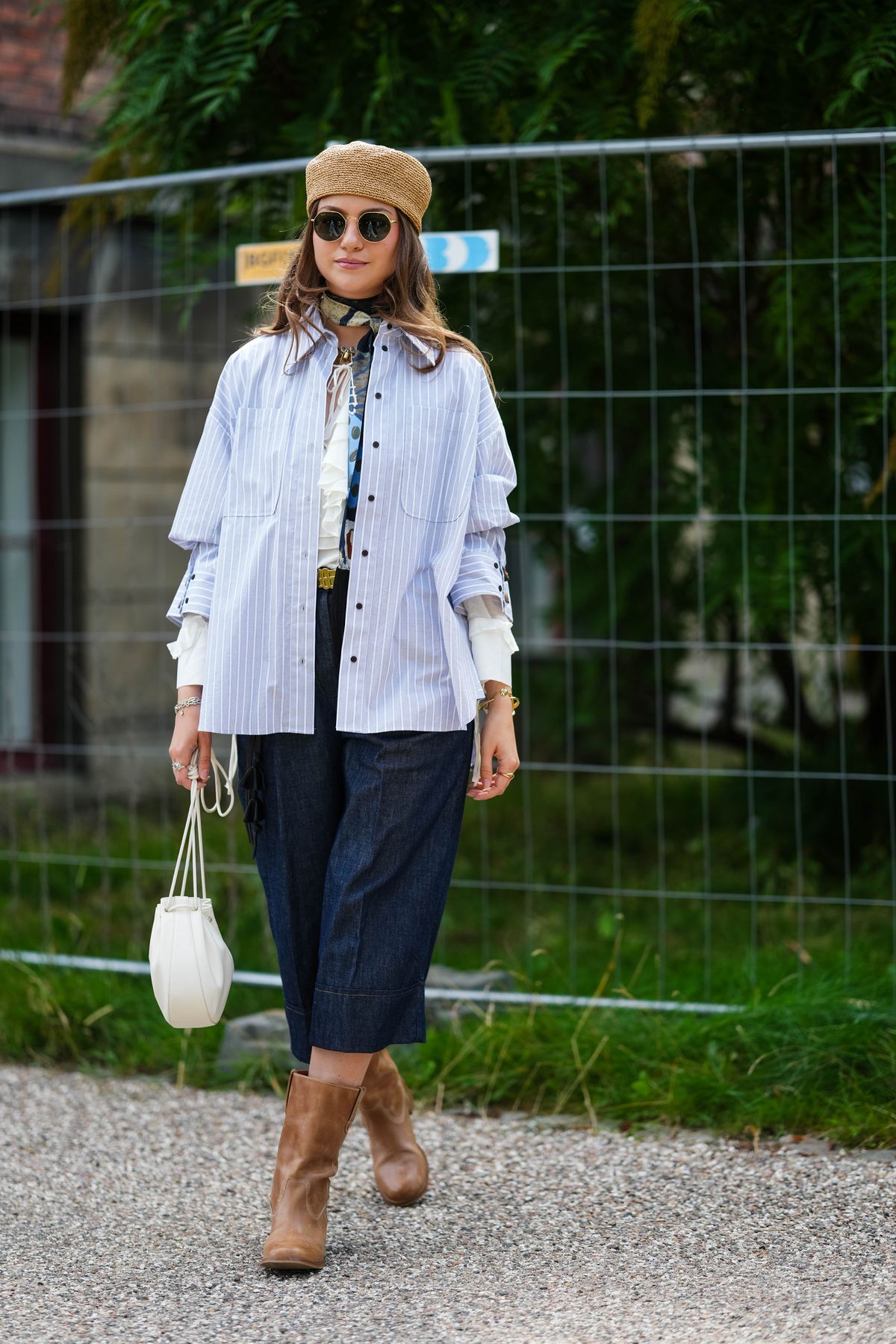 오버사이즈 셔츠에 청바지를 매치한 순간까진 평범했지만 브라운 앵클부츠가 더해지면서 이야기가 달라집니다. 미디 팬츠와의 조합 덕분에 다리 라인이 묘하게 살아나고, 베레모와 선글라스를 얹으니 마치 파리 카페에서 막 나와 산책을 즐기는 듯한 착각을 주죠. 게다가 작은 화이트 백 하나는 “오늘의 무드? 가볍고 경쾌해!”라고 선언하는 듯합니다.