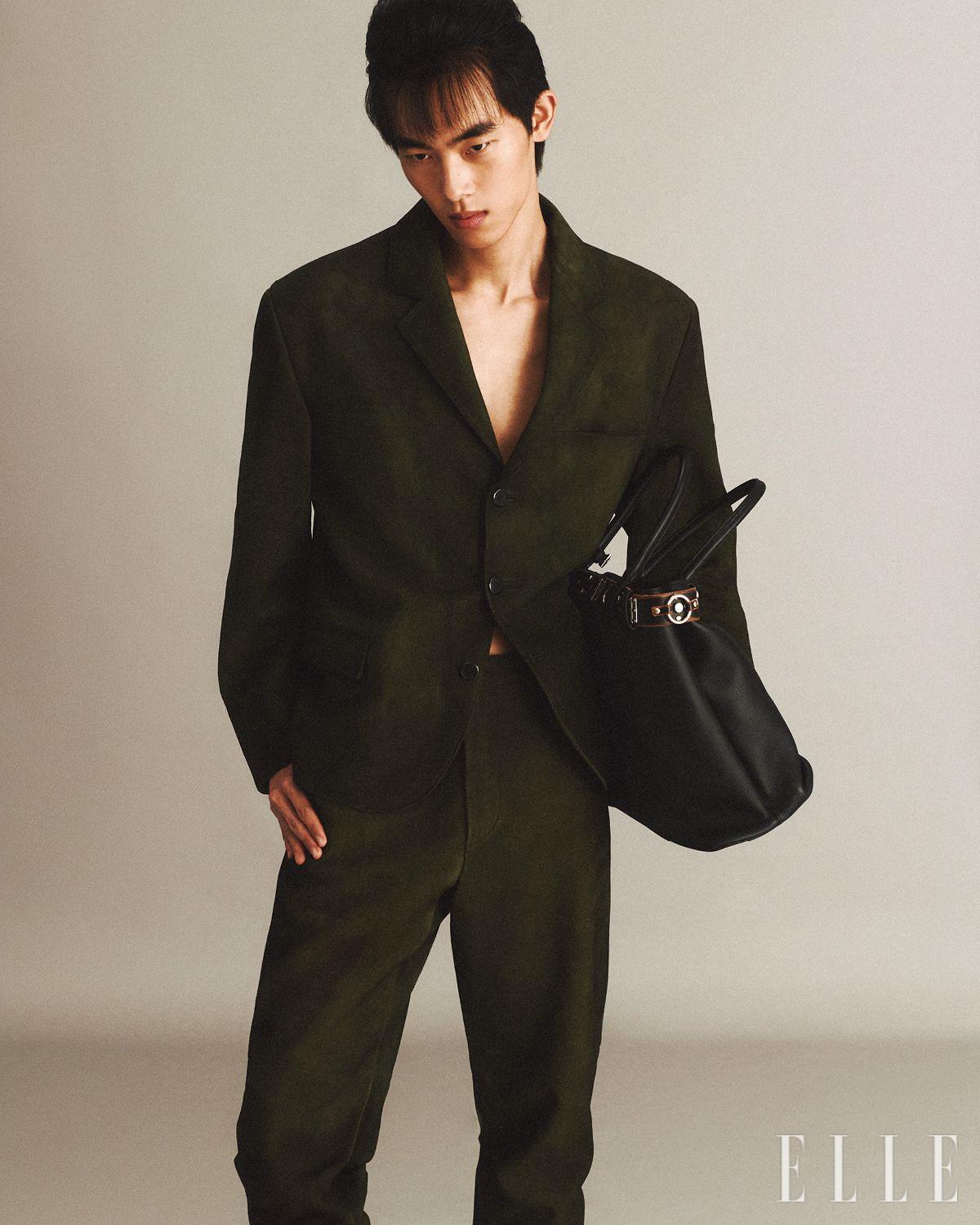 스웨이드 재킷과 팬츠, 버클 백, 가죽 부츠는 가격 미정, 모두 Prada.