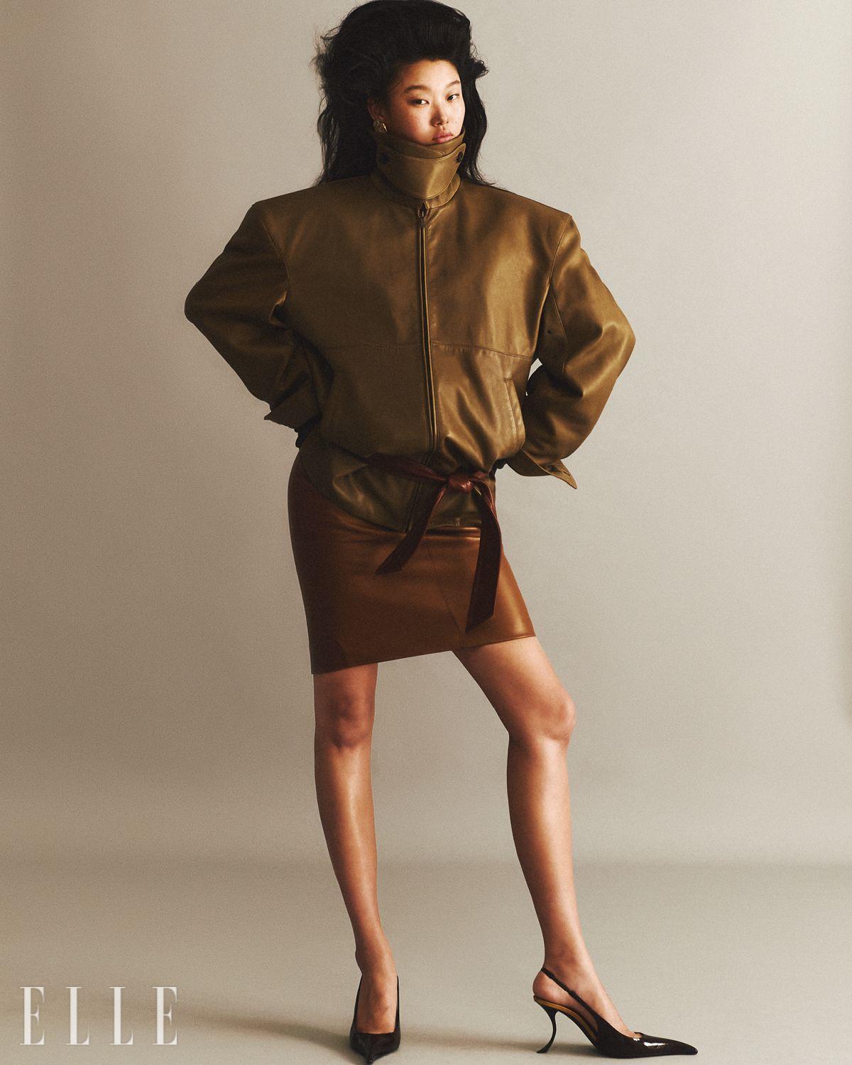 파워 숄더 블루종과 레더 스커트, 슬링백 샌들, 스테이트먼트 이어링은 가격 미정, 모두 Saint Laurent by Anthony Vaccarello.