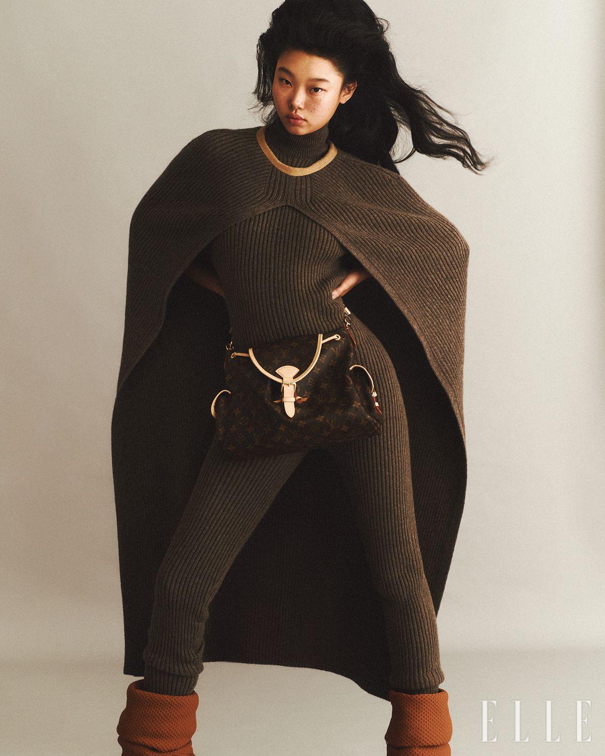 캐시미어 점프수트와 케이프, 오디세이 백, 미디 부츠는 가격 미정, 모두 Louis Vuitton.