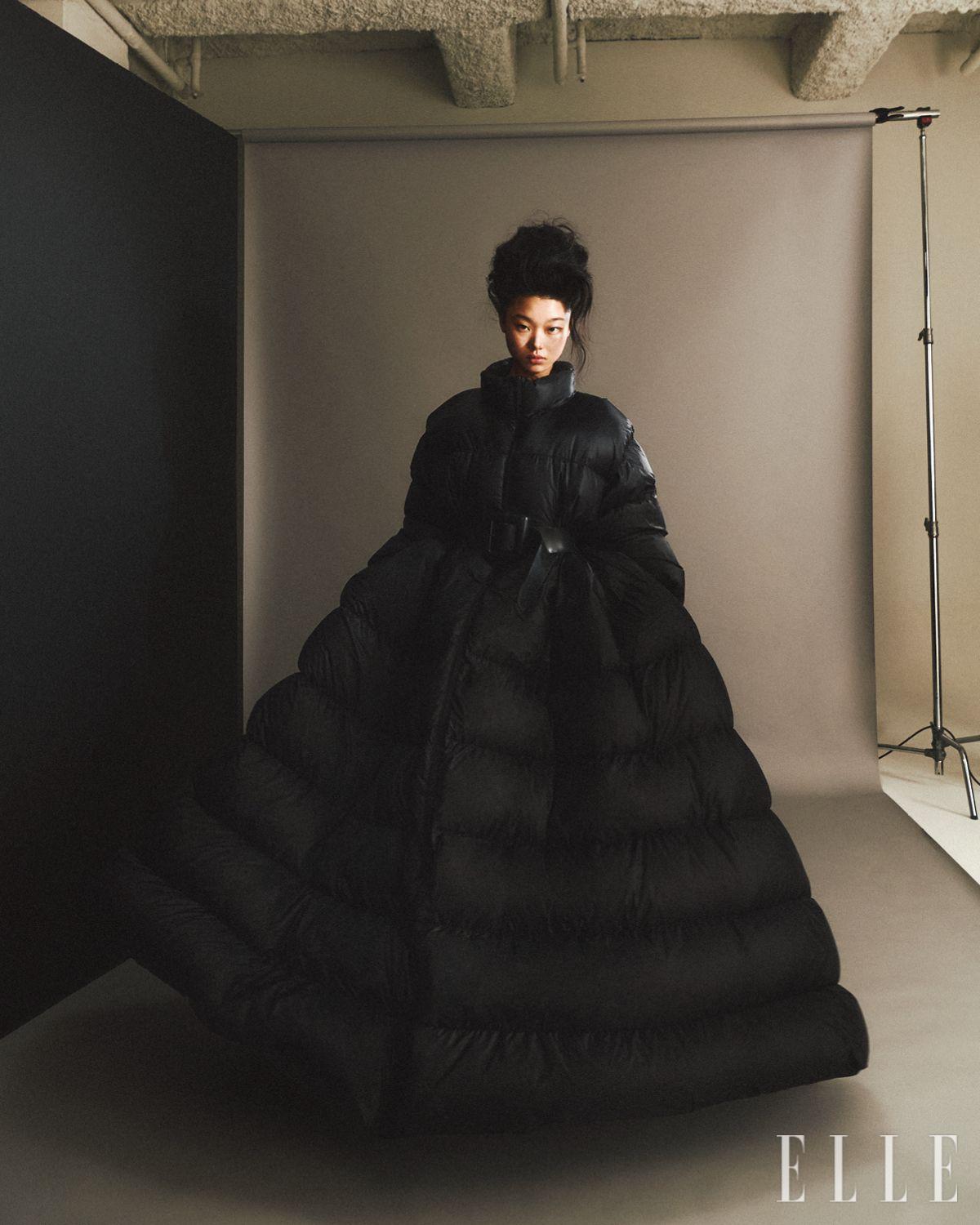 드라마틱한 볼륨의 블랙 패딩 드레스와 벨트는 가격 미정, 모두 Balenciaga.