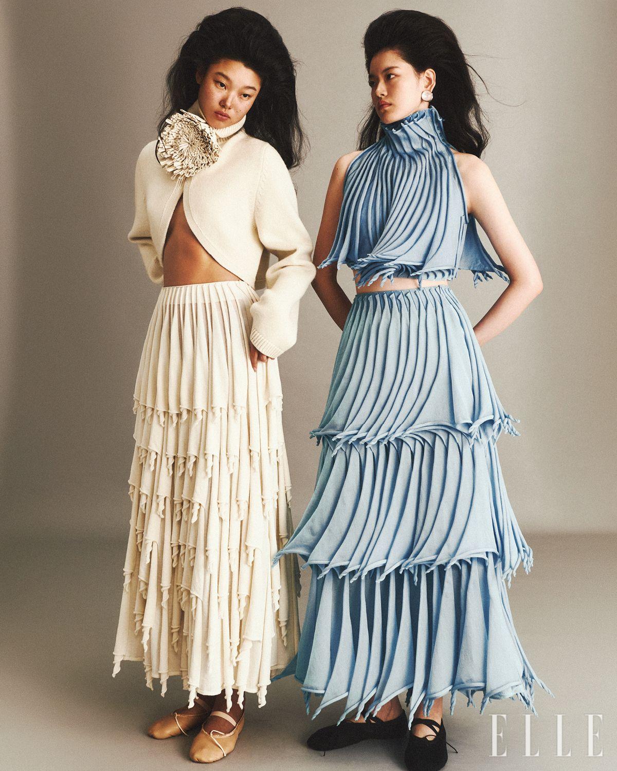 윤영이 입은 터틀넥 풀오버와 레더 플라워 초커, 플리츠스커트, 치에가 입은 크롭트 톱과 스커트, 이어링은 가격 미정 모두 Alaïa. 슈즈는 에디터 소장품.