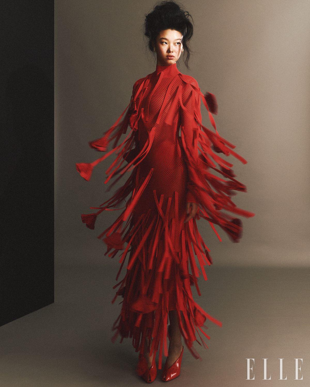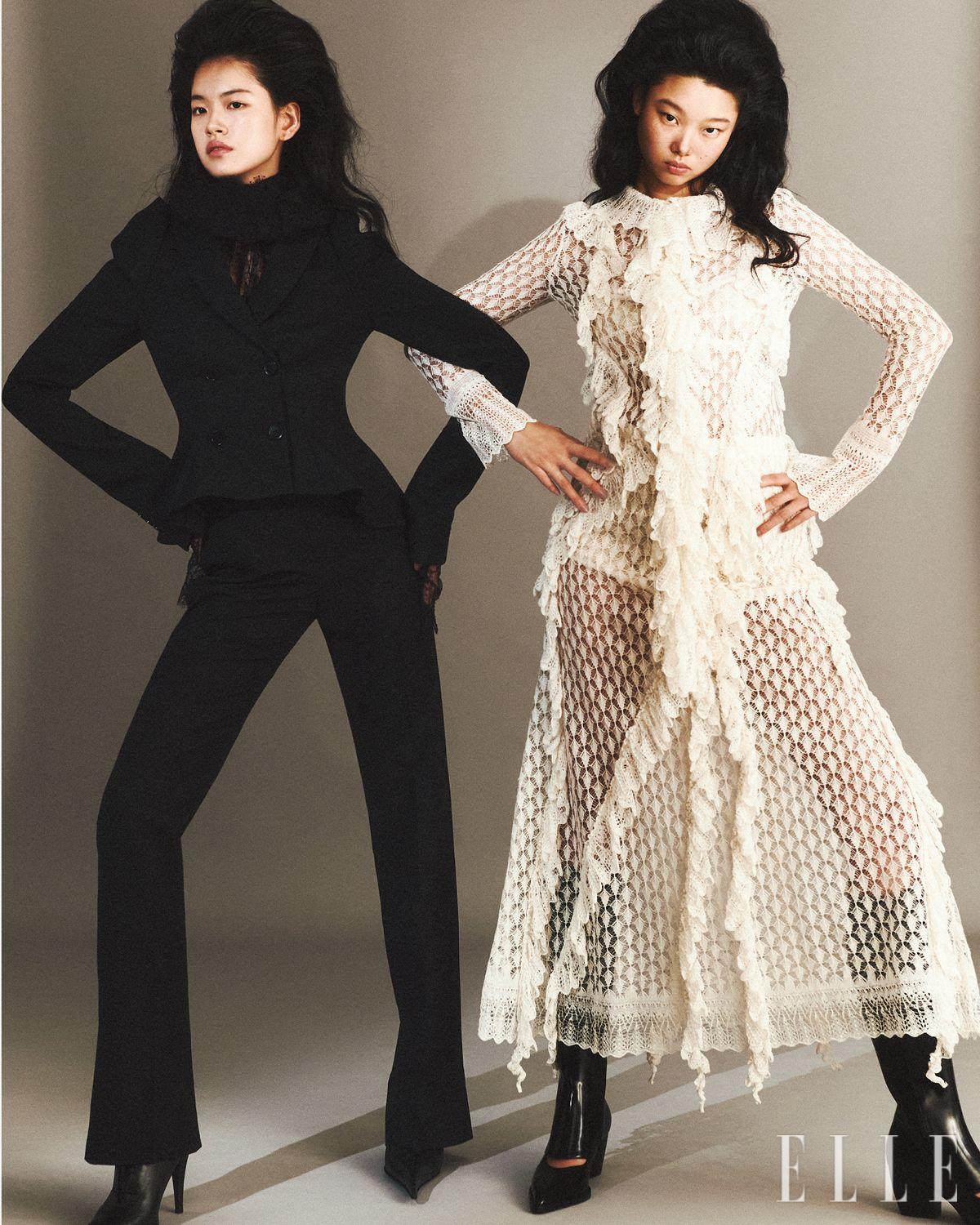 치에가 입은 턱시도 수트와 블라우스, 포인티드 토 부츠는 가격 미정, 모두 McQueen. 윤영이 입은 레이스 드레스와 브라, 브리프, 컷아웃 부츠는 가격 미정, 모두 Dior.