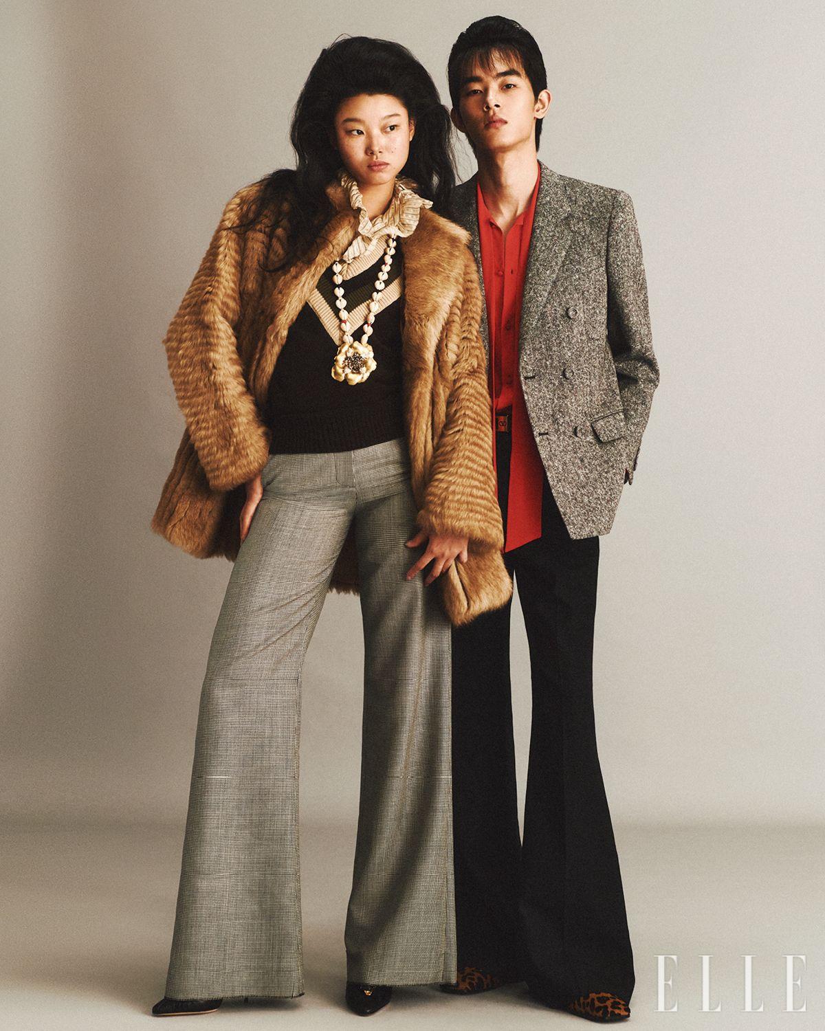 윤영이 입은 램 시어링 코트와 블라우스, 베스트, 팬츠는 가격 미정, 모두 Valentino. 네크리스와 샌들은 가격 미정, 모두 Valentino Garavani. 허웨이가 입은 재킷과 셔츠, 팬츠는 가격 미정, 모두 Valentino, 벨트와 로퍼는 가격 미정, 모두 Valentino Garavani.