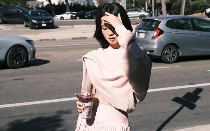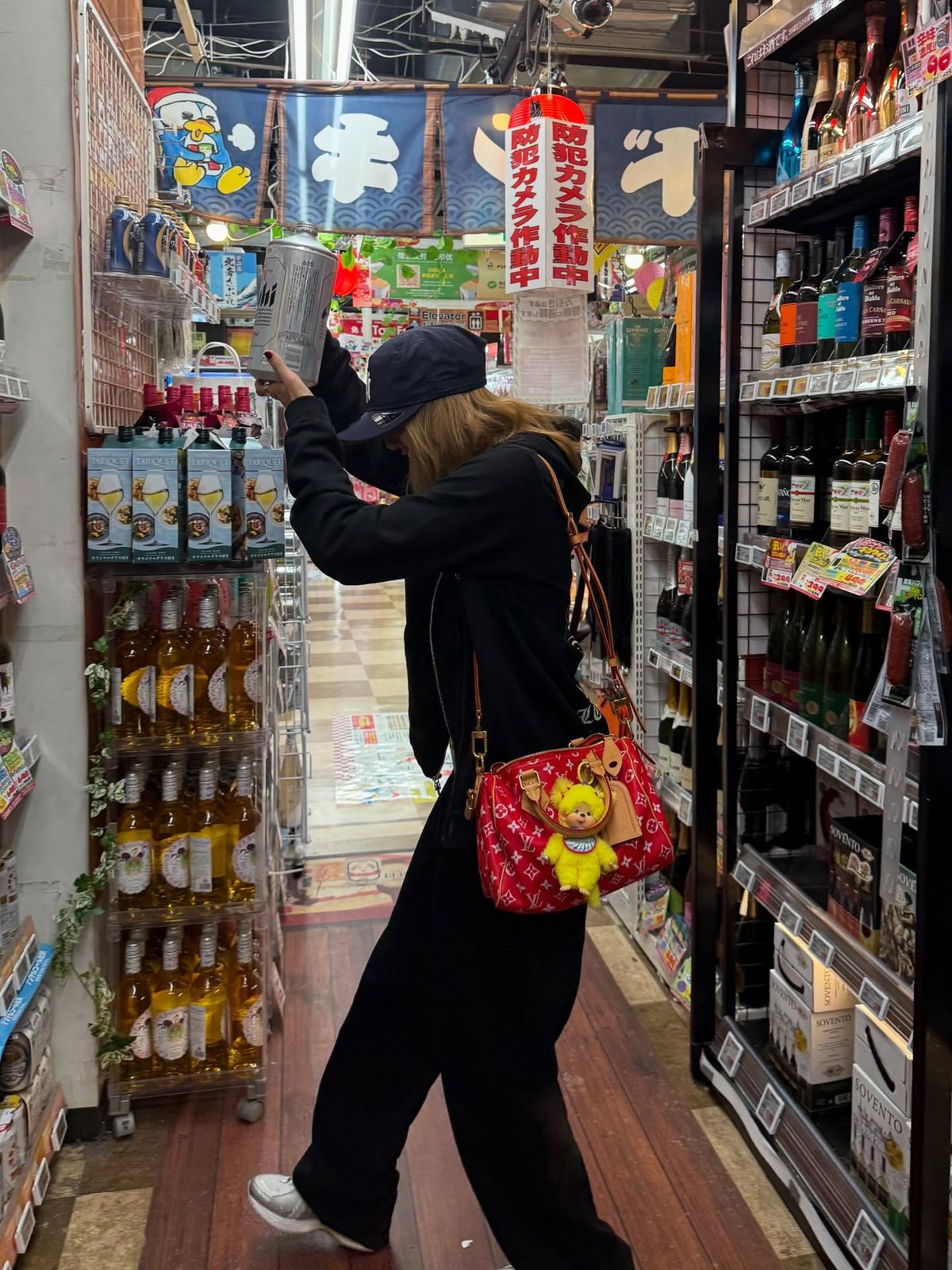 블랙 와이드 스웨트 팬츠 셋업에 크롭 톱, 그리고 브리프를 여러 겹 겹쳐 입은 듯한 레이어링까지 선보인 리사의 편의점 룩. 팬츠 밑단이 자연스럽게 흐르며 단순한 블랙 셋업에도 입체감을 더했습니다. 볼캡과 컬러풀한 백으로 마무리하니, 편의점 외출조차 힙한 무드로 변신했죠.