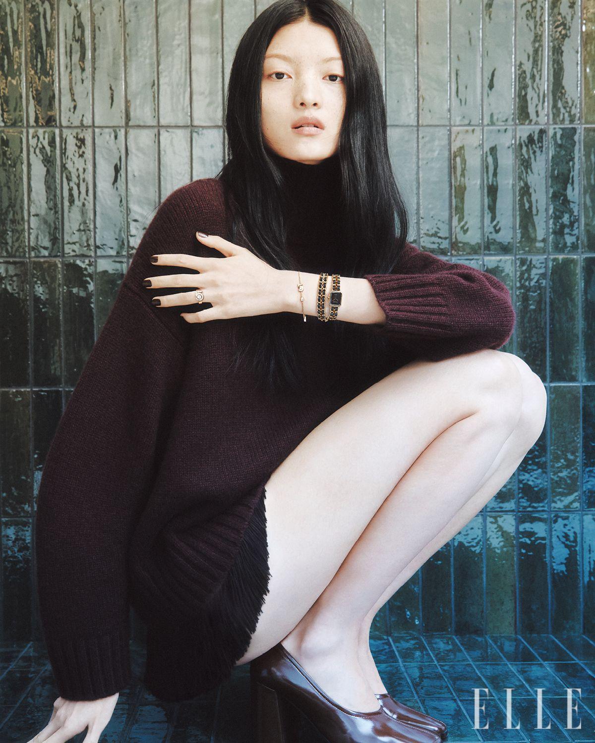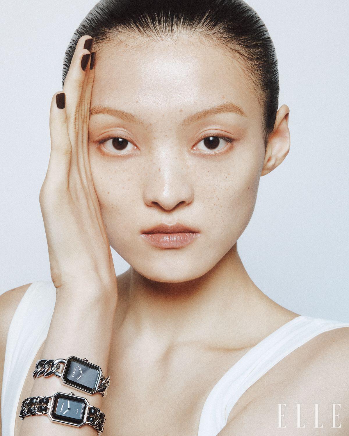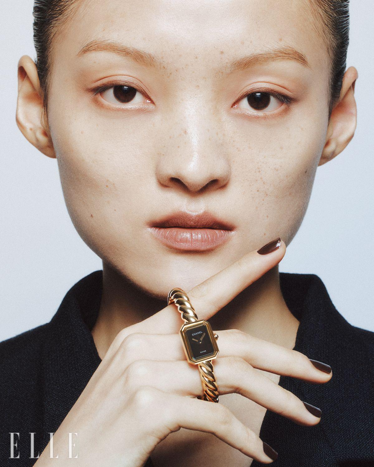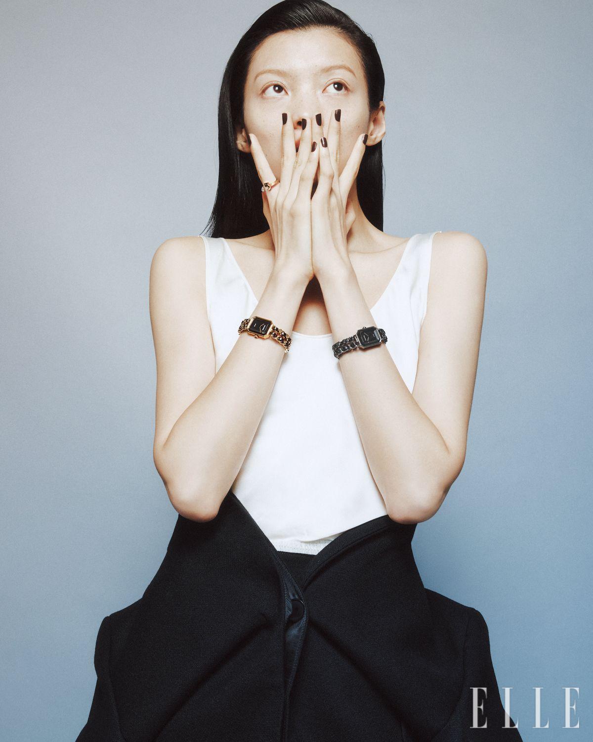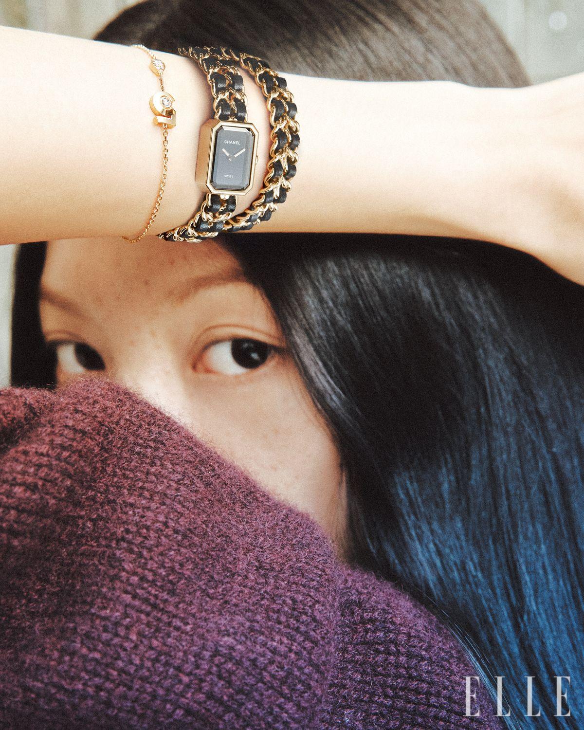 오른손에 착용한 옐로골드 프리미에르 오리지널 에디션 워치와 왼손에 착용한 스틸 프리미에르 아이코닉 체인 워치, 다이아몬드 세팅 베이지골드 N°5 링은 모두 Chanel Watches & Fine Jewelry.