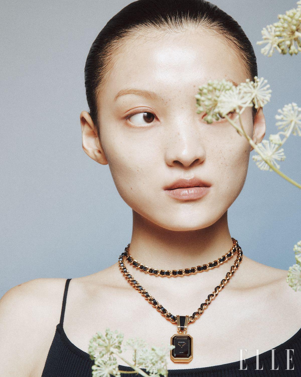 더블 스트랩이 특징인 스틸 케이스의 프리미에르 아이코닉 체인 더블 로 워치와 드롭형 디자인의 다이아몬드 세팅 화이트골드 N°5 이어링, 화이트골드 N°5 네크리스는 모두 Chanel Watches & Fine Jewelry.