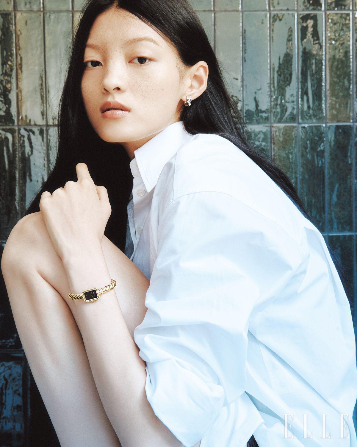아이코닉한 쿠튀르 브레이드를 뱅글에 재해석한 프리미에르 갈롱 워치, 화이트골드와 다이아몬드로 이뤄진 N°5 싱글 이어링은 모두 Chanel Watches & Fine Jewelry.