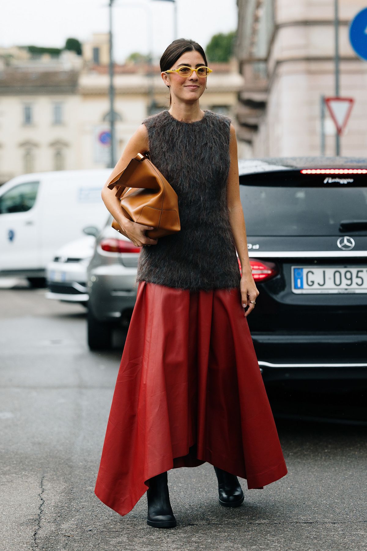 레드 스커트는 길이가 길어질수록 진가를 발휘합니다. 퍼 베스트나 텍스처가 두드러진 아우터와 믹스 매치하면 실루엣이 한층 드라마틱해지죠. 이때 상의 컬러는 브라운이나 블랙처럼 차분한 톤을 고르는 것이 안전합니다. 강렬한 레드에는 차분한 텍스처, 우아함을 위한 필승 공식을 기억해두세요.