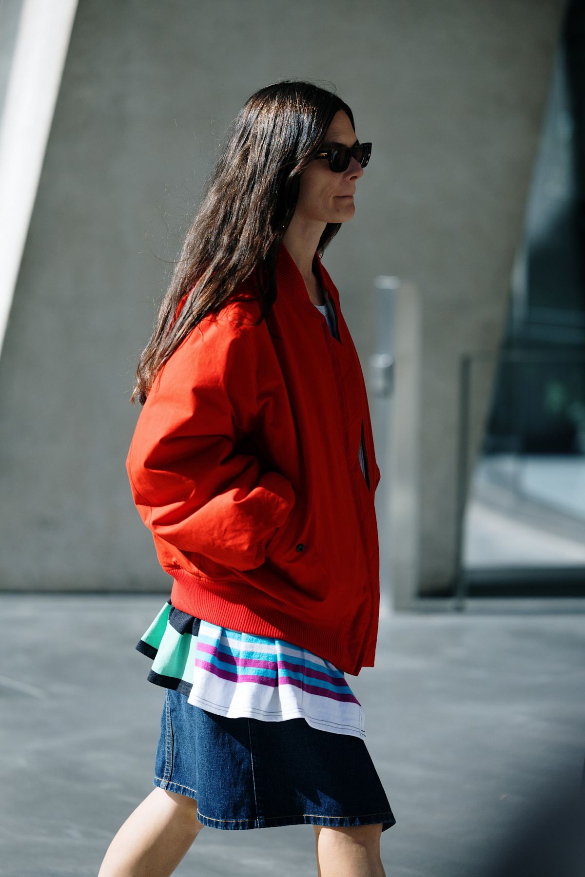 레드 컬러 아우터는 데님과 만나야 제맛입니다. 무릎길이 데님 스커트 위에 레드 블루종 하나만 걸쳐도 캐주얼한스트리트 무드가 완성되니까요. 스트라이프 티셔츠처럼 컬러가 섞인 톱을 더하면 자칫 과해 보일 수 있는 레드가 경쾌하게 중화되죠.