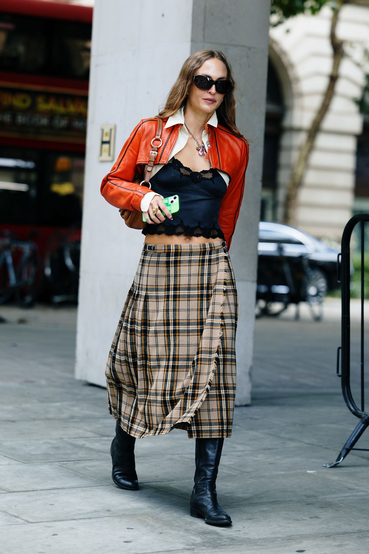가을 레더 자켓을 꼭 블랙만 고집할 필요는 없습니다. 의외로 레드를 선택하면 빈티지 체크 스커트도 훨씬 생동감 있게 살아나죠. 레이스 디테일이 돋보이는 블랙 톱과 롱부츠까지 더하면 반항적이면서도 여성적인 무드를 동시에 연출할 수 있습니다. 클래식한 패턴과 레드의 이색적인 조합을 주저하지 마세요.