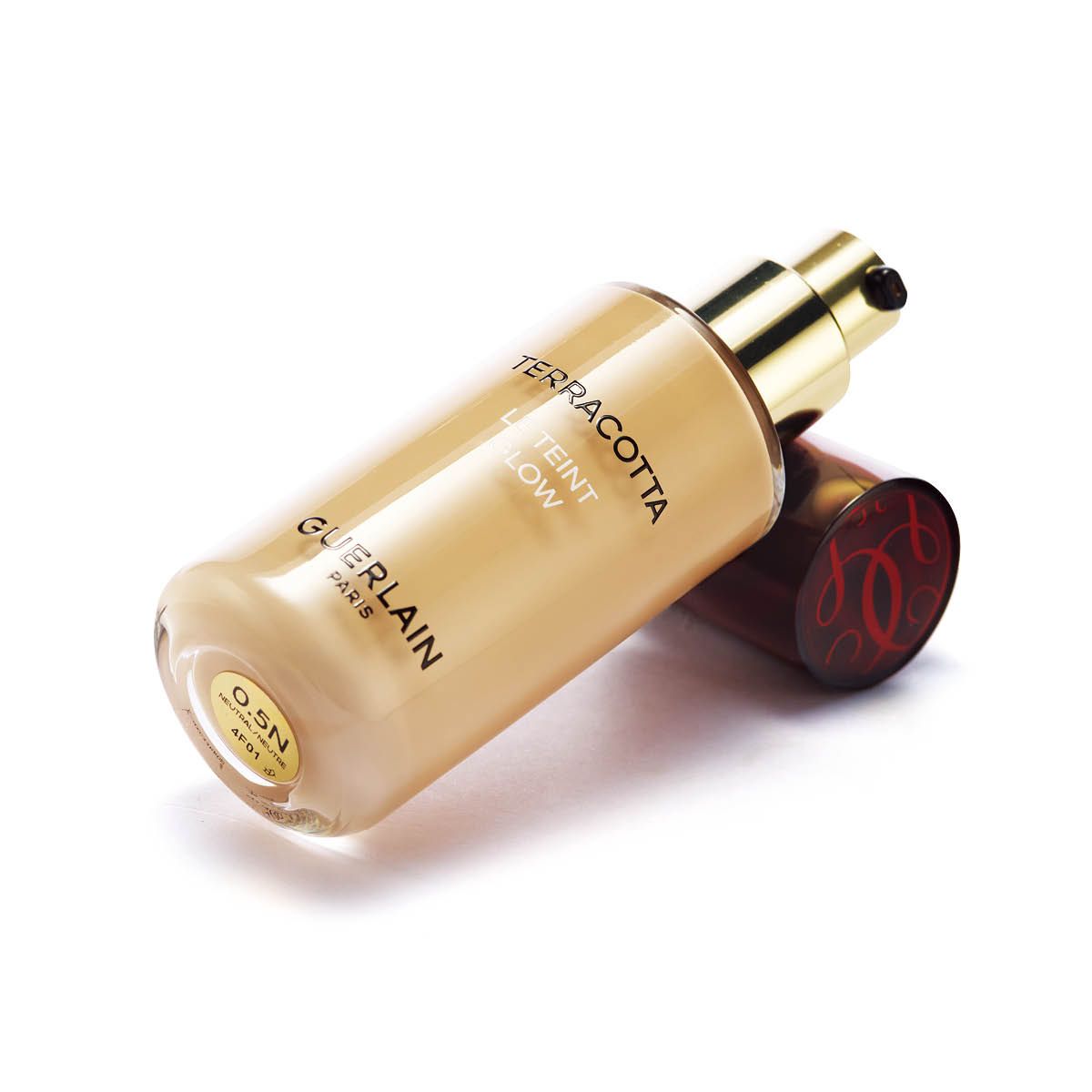 제형 속에 함유된 펄이 빛을 반사해 얼굴 전체를 화사하게 밝혀준다. 밀착력이 좋아 묻어남이 적은 테라코타 르 뗑 글로우 파운데이션, 0.5N, 9만1천원, Guerlain.