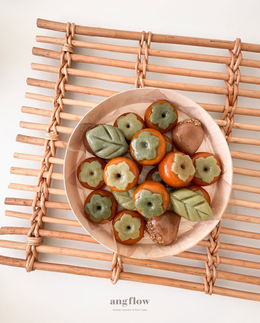 <앙플로우>의 송편은 계절감을 더욱 살렸습니다. 가을을 상징하는 감과 밤을 연상시키는 디자인으로 따뜻한 분위기를 전하죠.