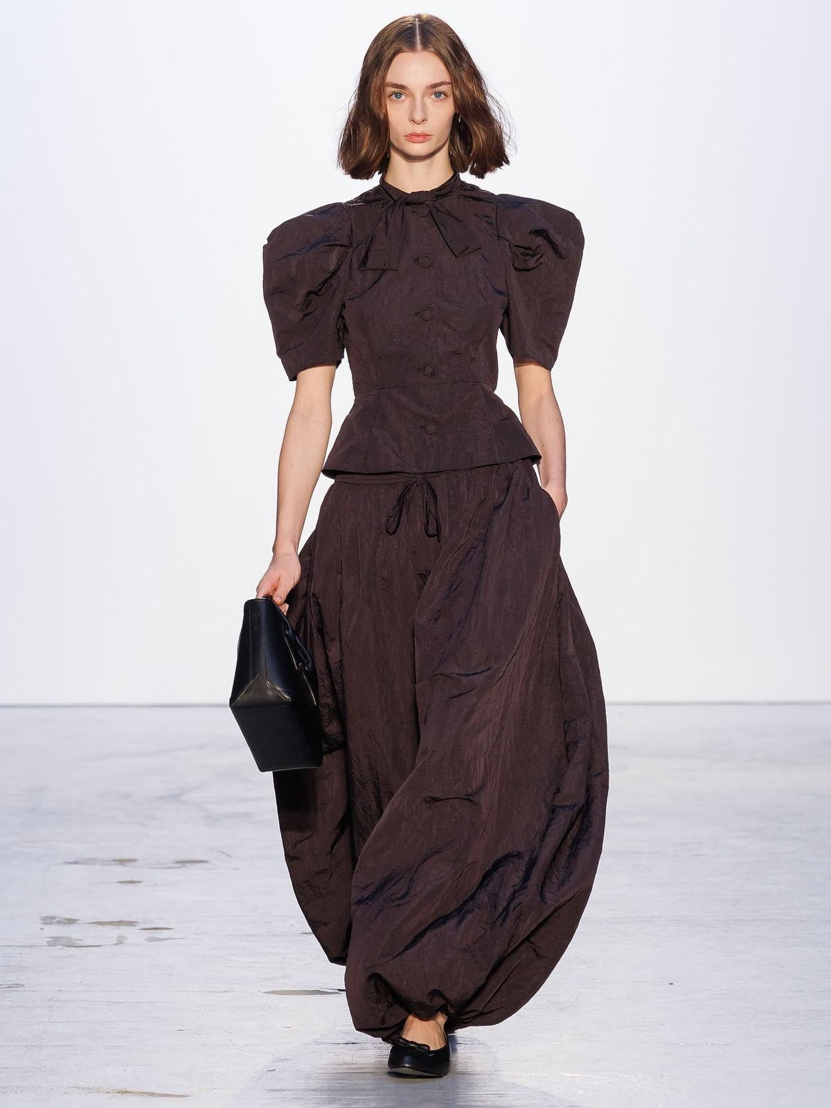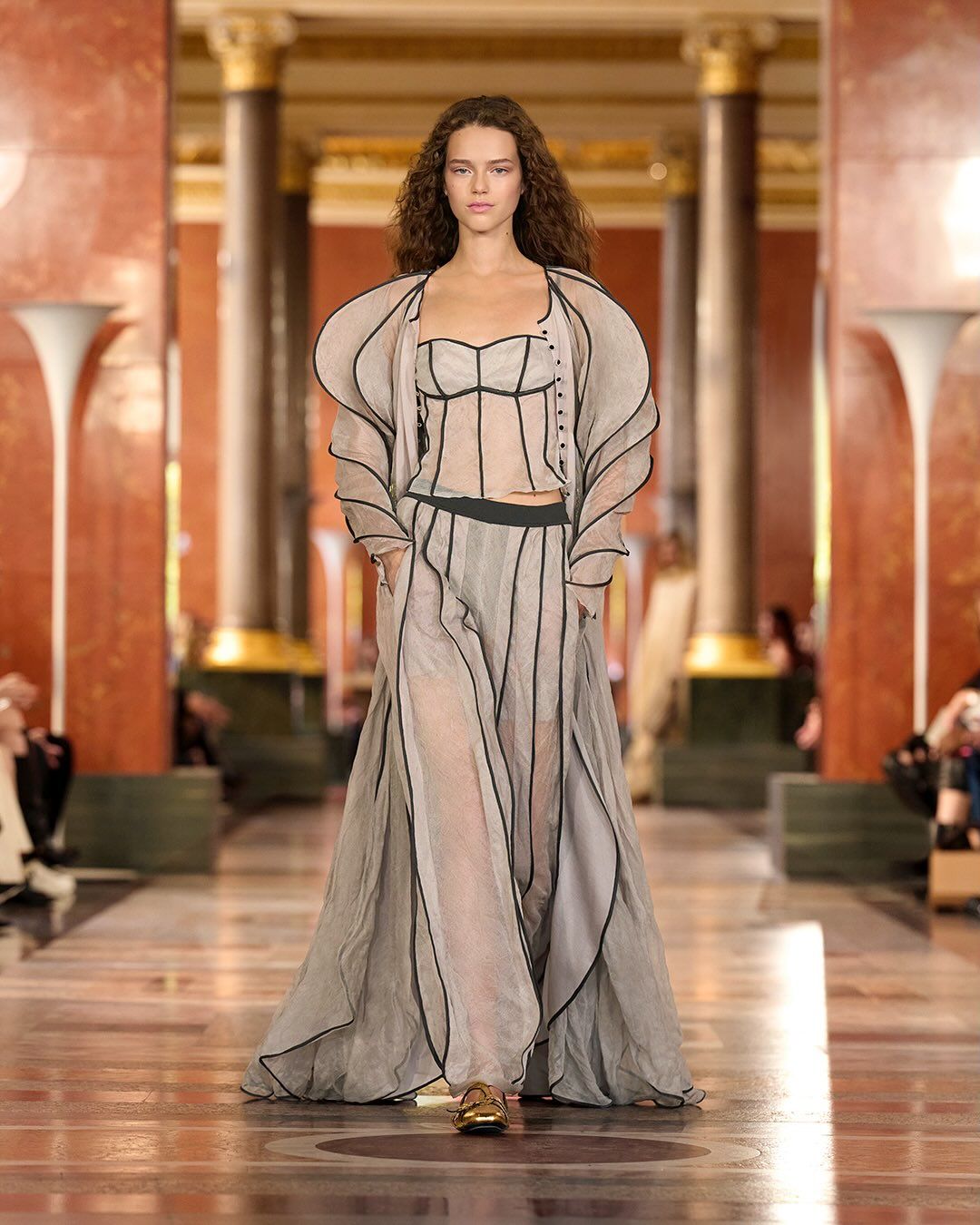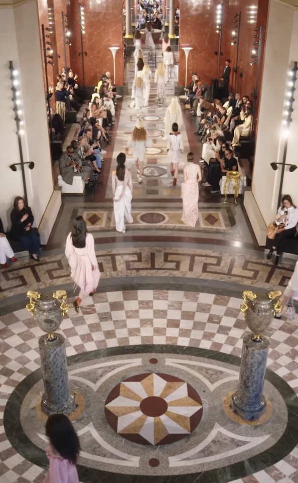 부드럽고 차분한 블란쳇의 목소리로 시작된 쇼는 ‘공간’, ‘집’, 그리고 ‘사적인 영역’을 주제로 한 이번 시즌의 메시지를 한층 서정적이고 힘 있게 전했습니다. 고전적이면서도 실험적인 공간 속, 텡기 데스타블의 사운드와 블란쳇의 목소리가 만나 오래된 아파트에 숨을 불어넣은 듯한 서사적 퍼포먼스를 완성했습니다.