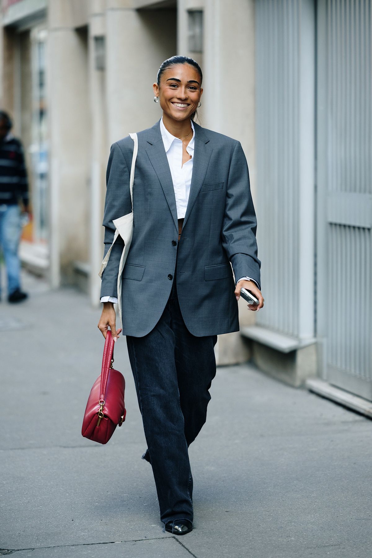 언뜻 보기엔 지극한 클래식한 그레이 수트이지만, 크롭 셔츠가 등장하는 순간 룩은 전혀 다른 이야기를 시작합니다. 살짝 드러난 셔츠 밑단이 여유와 리듬을 더하는데요. 여기에 레드 백으로 마무리하면 출근길조차 경쾌해지는 리얼 수트 라이프가 완성되죠.