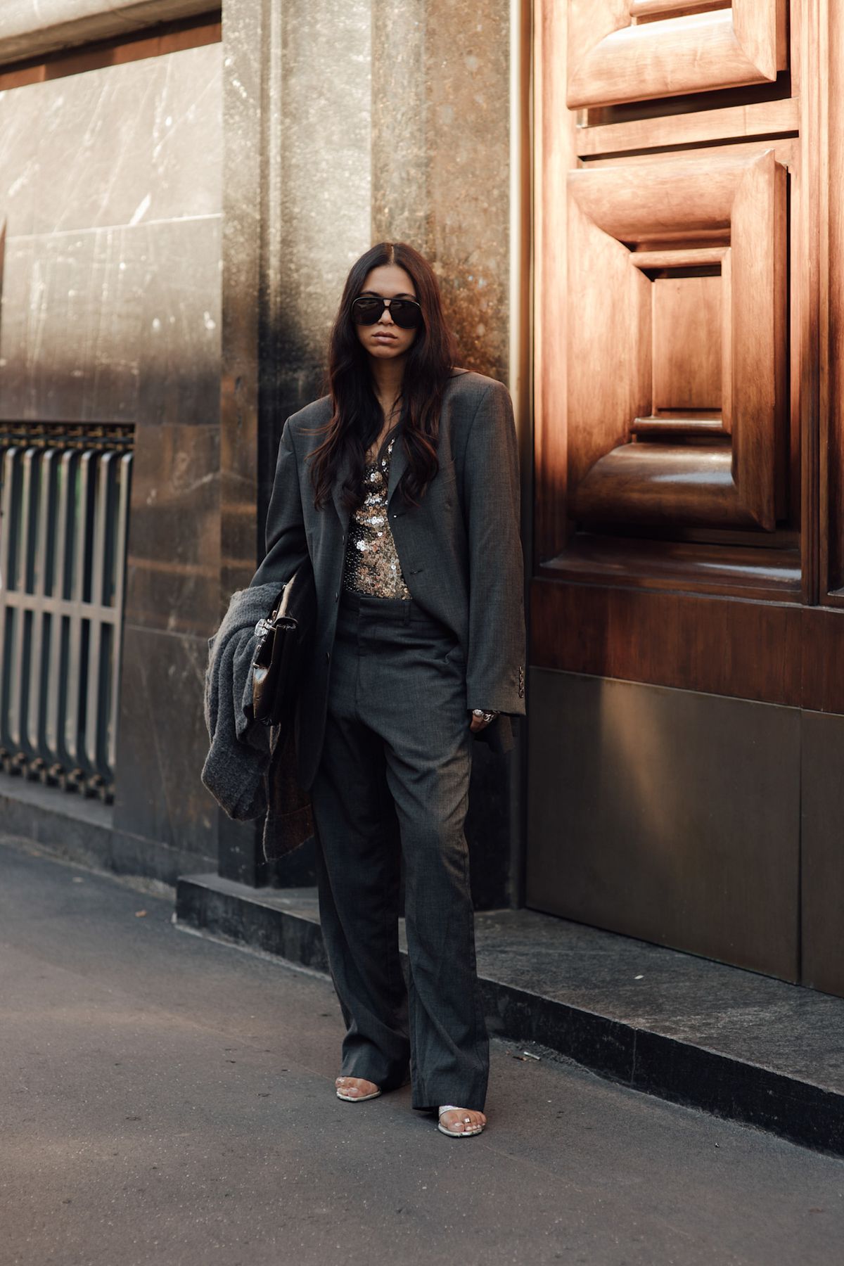 그레이 수트에 시퀸 톱 하나, 단정한 실루엣에 반짝임이 더해지는 순간 수트는 사무실 밖으로 탈출합니다. 정갈하면서도 확실한 디테일이 더해지니 어딘지 모를 평범함이 단번에 사라졌죠. 수트가 밤을 맞이하는 방식, 이것이 바로 글로우 드레싱입니다.