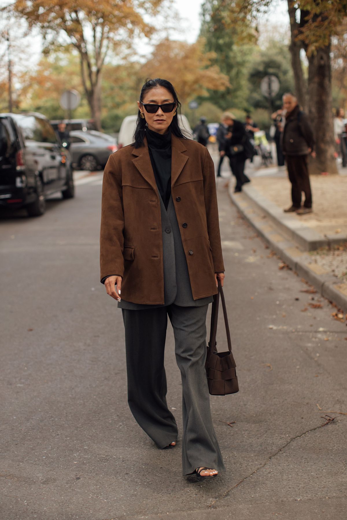 가을이야말로 블랙, 그레이, 브라운이 부드럽게 이어지는 톤 온 톤 레이어링을 즐기기에 제격인 계절이죠. 터틀넥 위로 수트를 걸치고, 그 위에 스웨이드 재킷을 더하니 가을의 기본기가 완성됩니다. 장식은 모두 덜고, 실용적인 토트백 하나면 충분하죠. 현실적이지만 세련된, 바로 지금 즐기기 좋은 가을 수트 룩입니다.