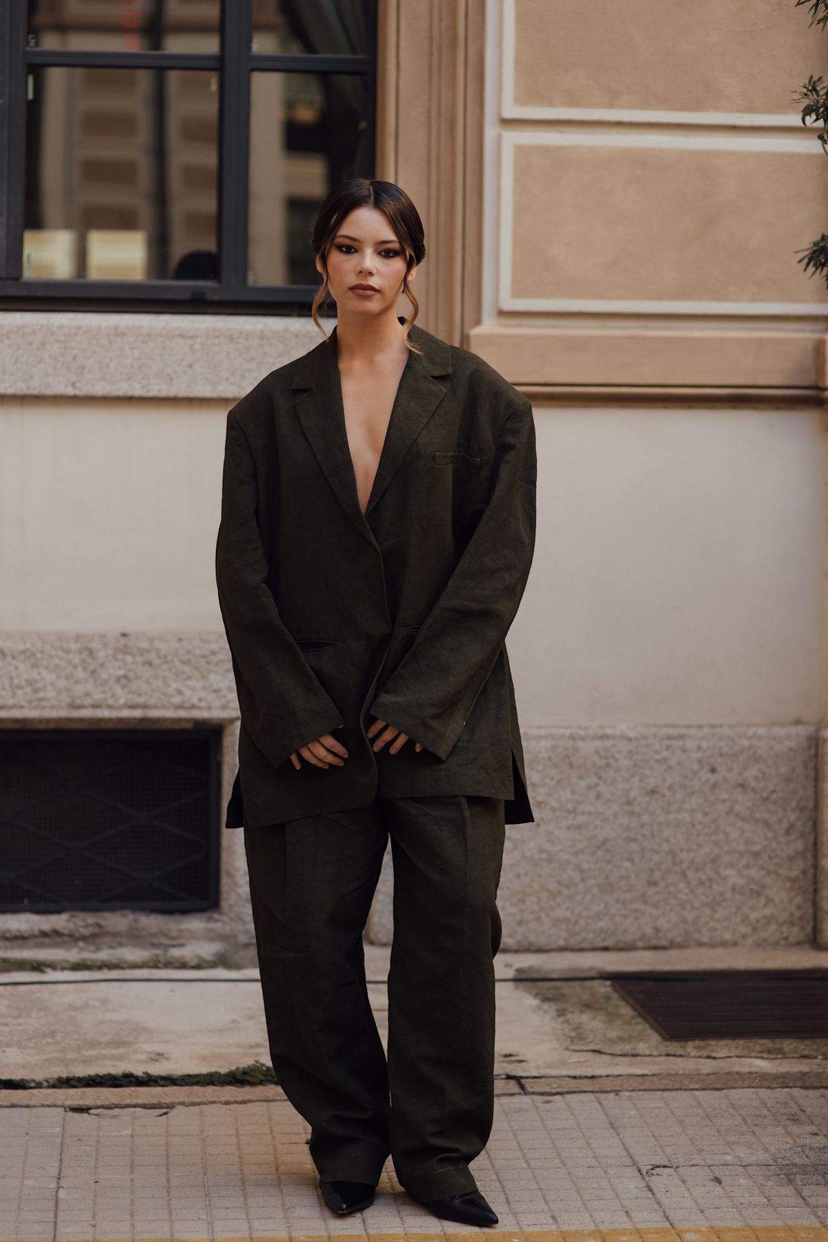 어깨선이 살짝 떨어지는 오버사이즈 실루엣, 셔츠 대신 맨피부 위로 가볍게 얹은 재킷. 수트의 권위를 덜어내자 오히려 존재감이 커집니다. 짙은 카키와 박시한 비율이 주는 여유 속에서 파워 드레싱 대신 쿨 드레싱이라는 새로운 룰이 완성되죠. 지루하지 않지만 단단한 힘이 느껴지는군요.