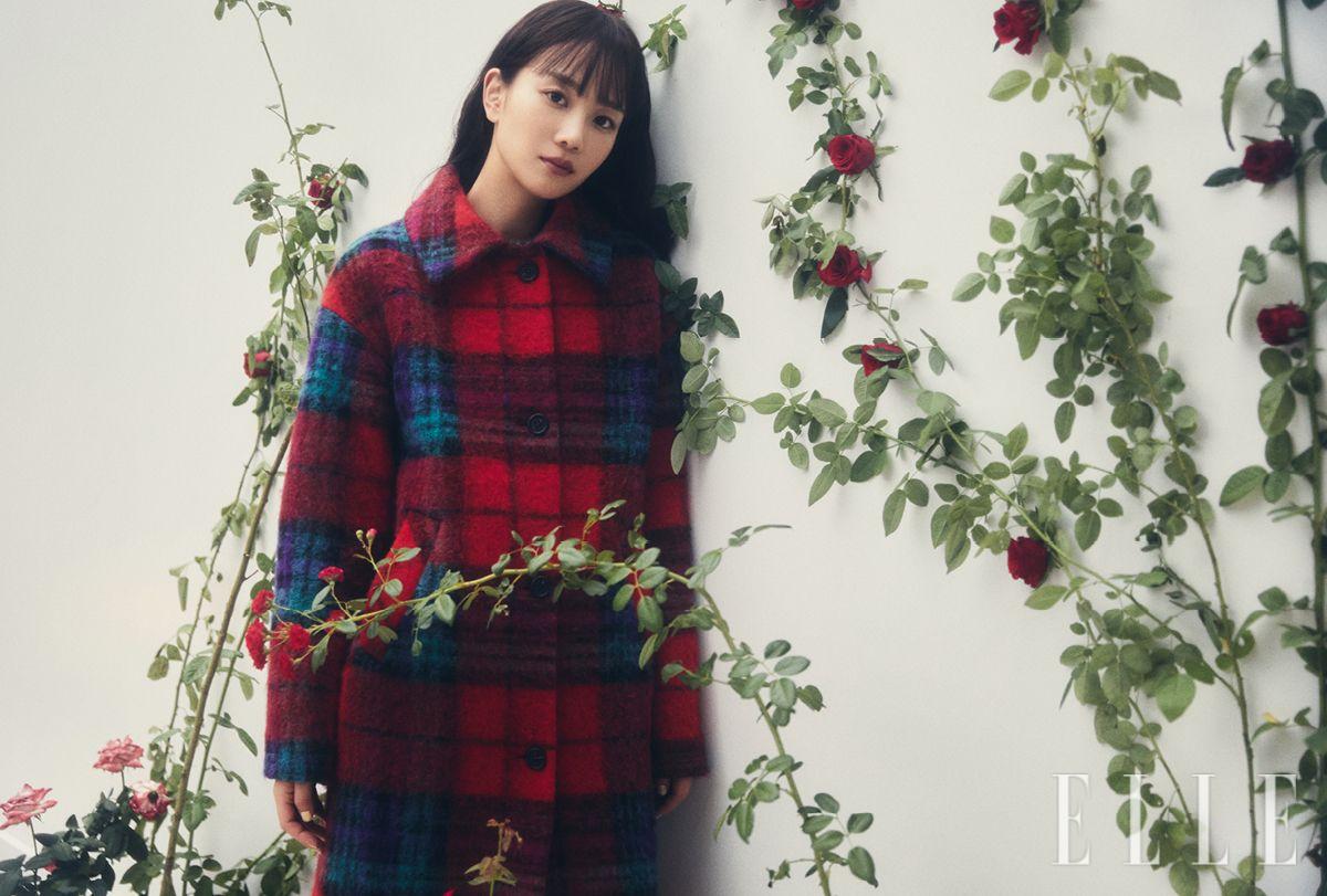 토글 버튼 디테일의 체크 코트는 Benetton.