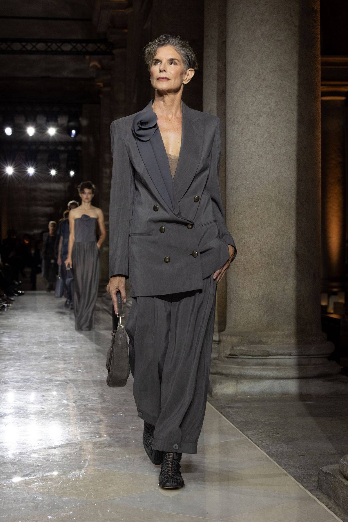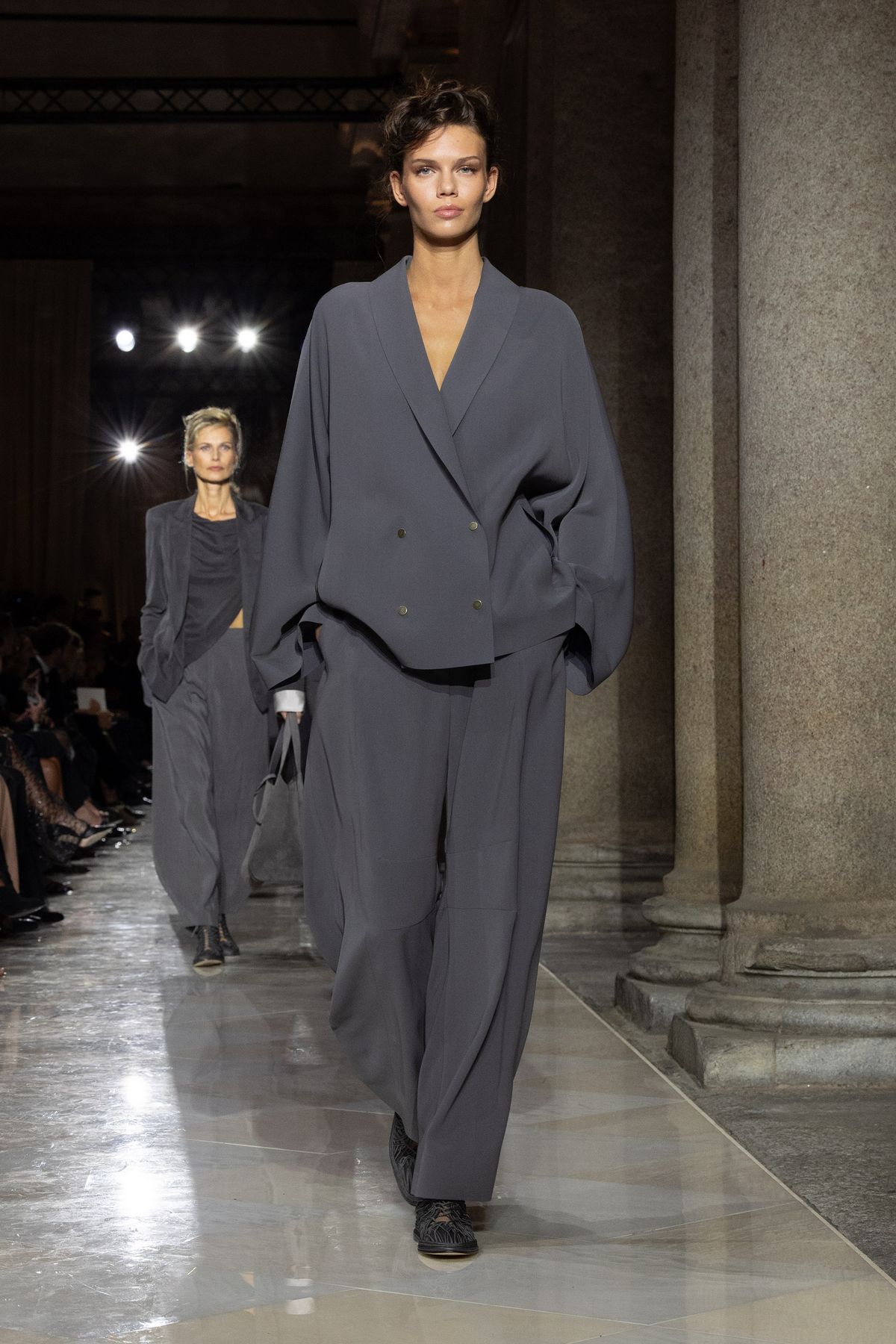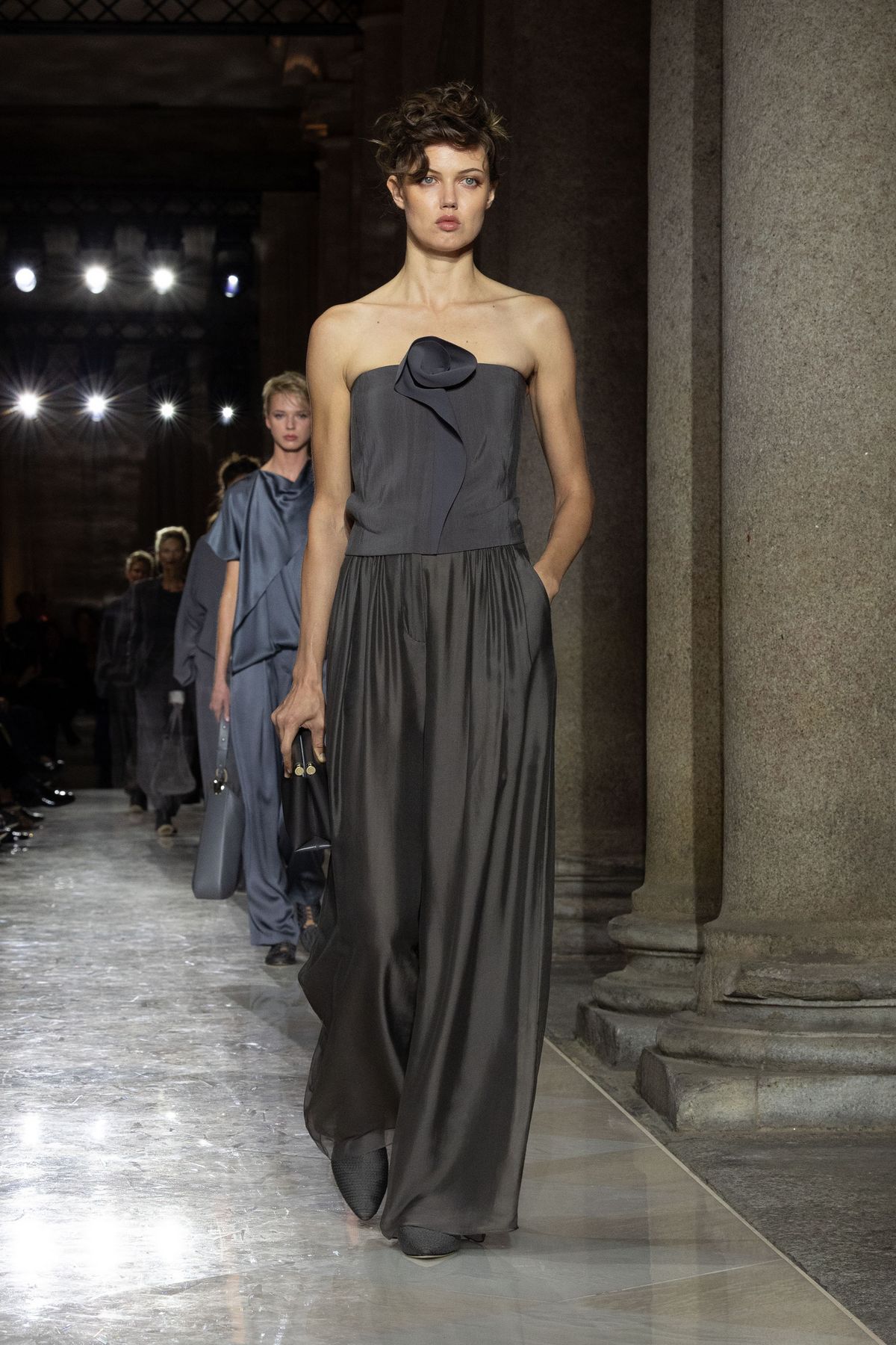 이번 컬렉션은 밀라노의 도시적 리듬과 지중해의 섬 판텔레리아의 풍경을 오가며 구성됐습니다. 유럽과 아프리카의 경계에 위치한 판텔레리아는 이국적인 매력과 야생의 자연을 품은 지역으로 아르마니의 감성에 깊은 영향을 줬다고 합니다. 이 대비적인 풍광의 이미지 속에서 컬렉션은 도시와 자연, 구조와 자유, 질서와 감정의 균형을 탐구했습니다. 룩의 요소들은 마치 섬의 바람에 흔들릴 듯 가볍고 유동적으로 보였죠. 특히 고급스러운 테일러링과 가벼운 질감의 드레스는 긴 실루엣이 강조됐고, 흐르는 듯한 패브릭의 움직임이 우아함을 극대화했는데요 각각의 룩은 단 하나의 제스처만으로도 ‘무게감 없는 옷이 가장 강력한 메시지를 전한다’는 그의 철학을 구현했습니다.