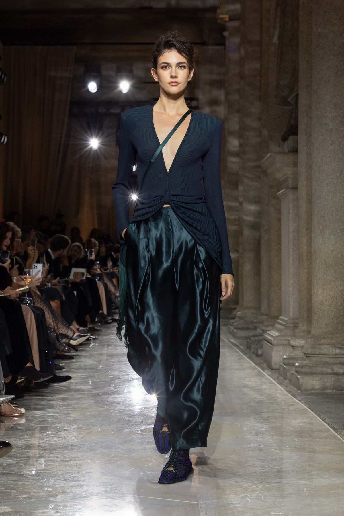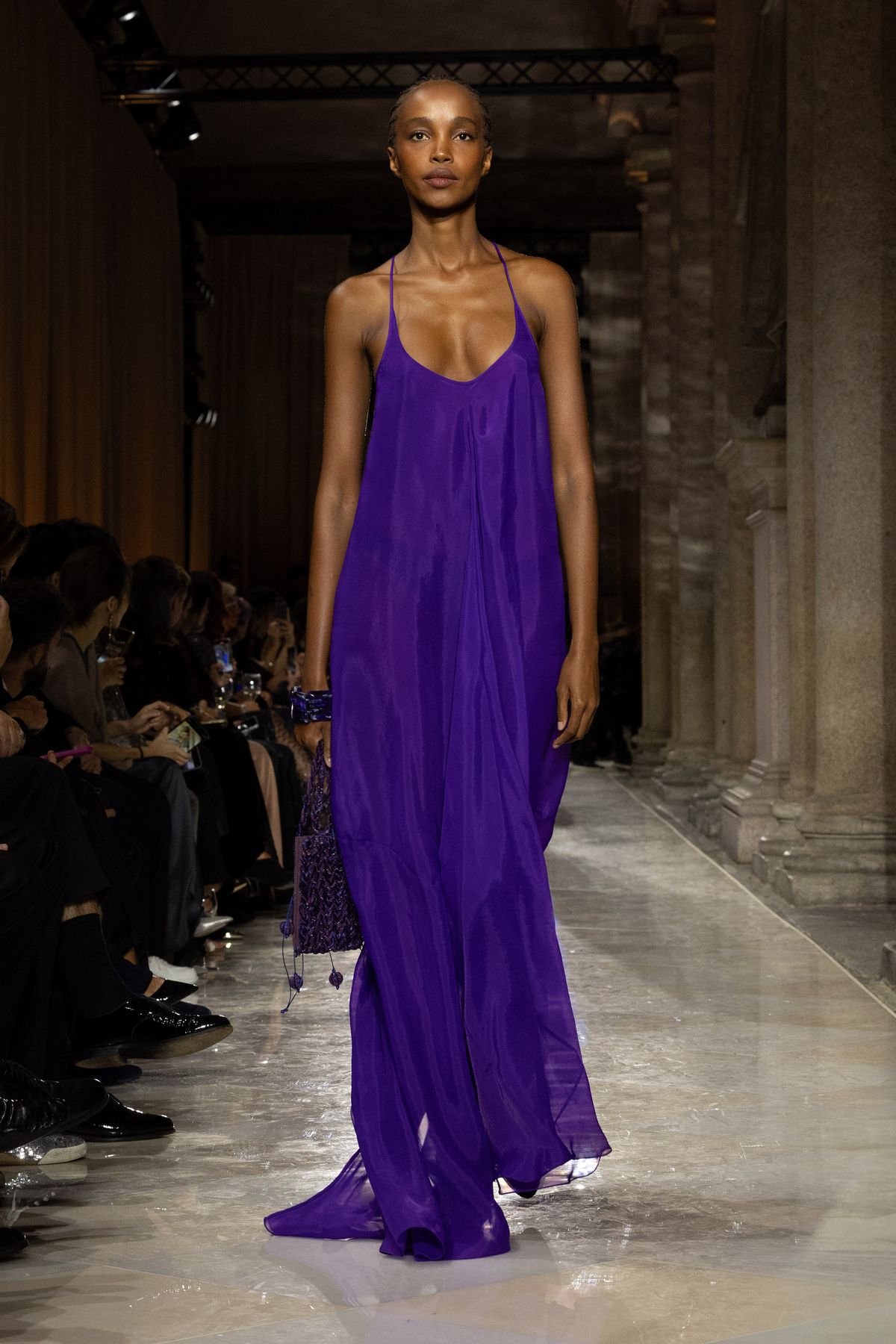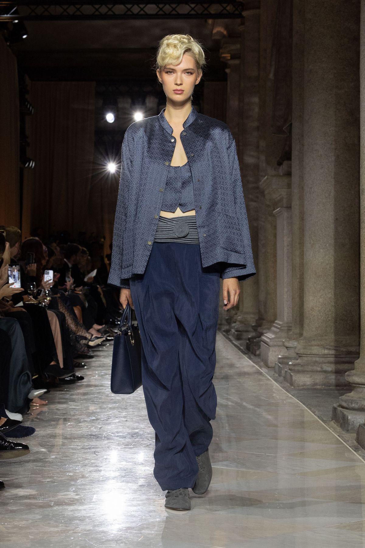 이번 컬렉션은 밀라노의 도시적 리듬과 지중해의 섬 판텔레리아의 풍경을 오가며 구성됐습니다. 유럽과 아프리카의 경계에 위치한 판텔레리아는 이국적인 매력과 야생의 자연을 품은 지역으로 아르마니의 감성에 깊은 영향을 줬다고 합니다. 이 대비적인 풍광의 이미지 속에서 컬렉션은 도시와 자연, 구조와 자유, 질서와 감정의 균형을 탐구했습니다. 룩의 요소들은 마치 섬의 바람에 흔들릴 듯 가볍고 유동적으로 보였죠. 특히 고급스러운 테일러링과 가벼운 질감의 드레스는 긴 실루엣이 강조됐고, 흐르는 듯한 패브릭의 움직임이 우아함을 극대화했는데요 각각의 룩은 단 하나의 제스처만으로도 ‘무게감 없는 옷이 가장 강력한 메시지를 전한다’는 그의 철학을 구현했습니다.