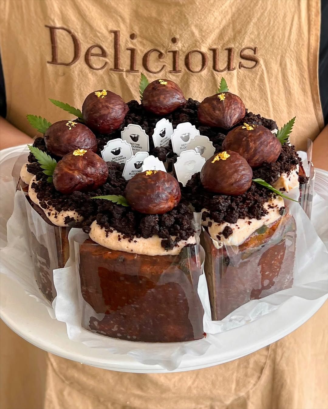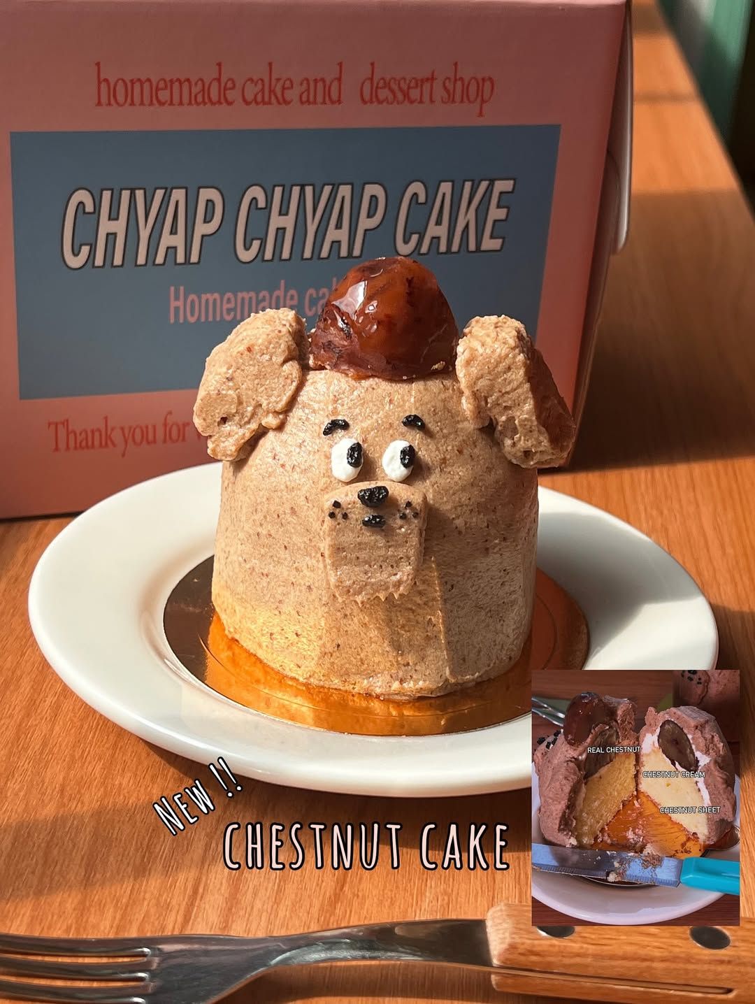 <챱챱케이크>의 '곰블랑'은 이름처럼 귀여운 비주얼로 눈길을 끕니다. 곰돌이 머리 위에 보늬밤이 모자처럼 올라가 있어 보기만 해도 사랑스럽죠. 그 덕분에 기념일 선물용으로 인기가 높다고 해요.
