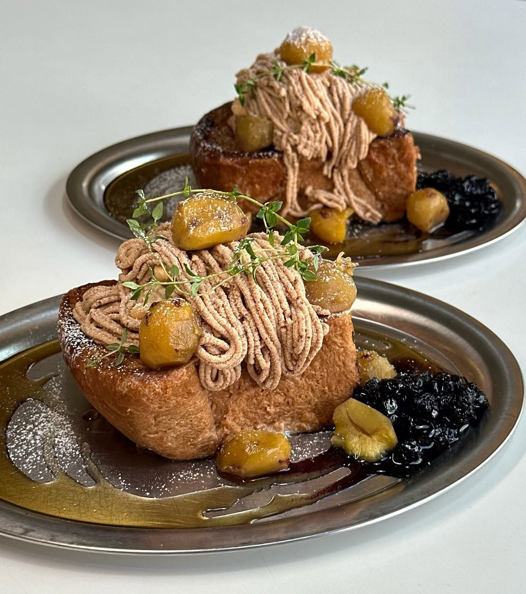 <크레뮤 러빙 클럽>의 '보늬밤 프렌치토스트'는 식사 대용으로도 좋을 것 같은데요. 보늬밤을 시작으로 브리오슈 프렌치토스트, 블루베리 콤포트, 구운 땅콩 등이 푸짐하게 더해져 비주얼부터 군침이 돕니다.