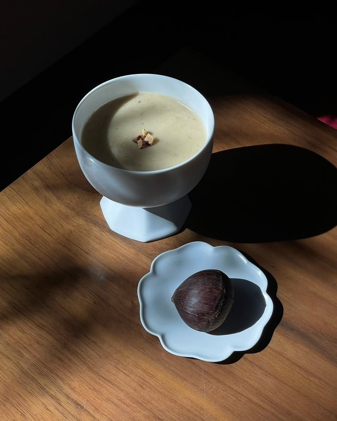 카페 <적당>에선 올해 수확한 공주 햇밤을 사용해 보다 깊은 맛을 살렸습니다. 크리미한 밤크림스프도 맛볼 수 있는데 함께 제공되는 밤을 곁들여 먹으면 더욱 맛이 좋다고 하네요.