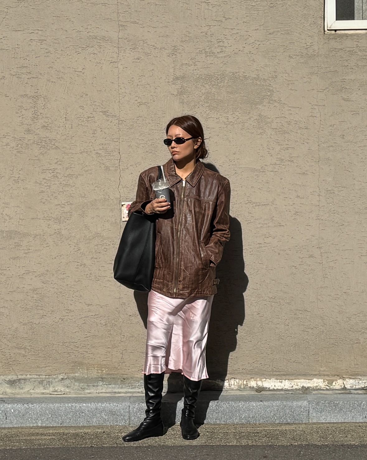 가죽 롱부츠는 보온성은 물론 실루엣을 정리해 주며 룩에 확실한 엣지를 더해줍니다. 김소진은 셔링 디테일의 스커트에 블랙 레더 부츠를 매치해 시크한 무드를 완성했죠. 또 다른 룩에서는 분홍 새틴 스커트와 가죽 재킷을 함께 매치해 부드러움과 강렬함 사이의 균형을 절묘하게 잡아냈습니다. 특히 김소진처럼 레더를 적극적으로 활용하면서 밸런스를 맞추고 싶다면 톤을 달리해보세요. 올가을, 페미닌한 아이템에 시크함을 더하고 싶다면 롱부츠만큼 확실한 선택은 없을 거예요.