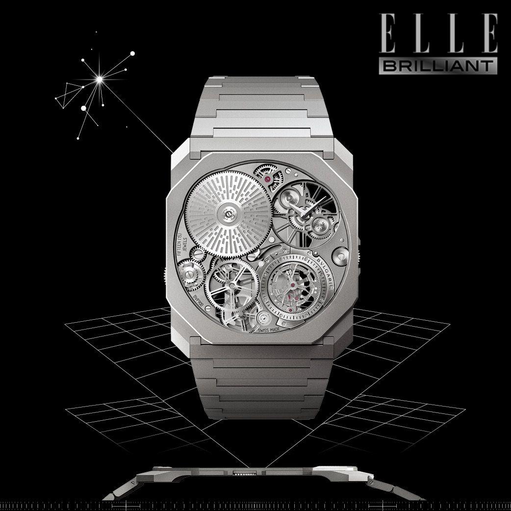 오늘날 가장 많은 수상 기록을 자랑하는 옥토 피니씨모 컬렉션이 2025년, 세계에서 가장 얇은 플라잉 투르비용 워치라는 기록을 다시 한번 갱신하며 새로운 역사를 써 내려간다. 시계가 어디까지 얇아질 수 있는지에 대한 도전이자 해답으로 불가리는 두께가 불과 1.85mm에 불과한 ’옥토 피니씨모 울트라 투르비용’ 워치를 선보였다. 얇은 두께의 핵심은 워치 구조의 근본적인 혁신에 있다. 일반적인 워치는 케이스 안에 무브먼트를 담지만, 이 제품은 텅스텐 카바이드 소재의 메인 플레이트가 케이스 역할을 겸하며 무브먼트를 품는다. 베젤, 케이스 보디, 러그 또한 가볍고 내구성이 뛰어난 마이크로비즈 프로스티드 티타늄으로 제작해 전체 두께를 최소화하도록 했다. 브레이슬릿 역시 같은 소재를 사용해 폴딩 버클을 포함한 전체 두께가 단 1.5mm에 불과하다. 최적의 가독성을 위해 샌드블라스트 처리된 브라스 소재 다이얼에는 로듐 도금 처리한 아워·미니트 핸즈를 배치했다. 또한 이전 모델의 레귤레이터 방식과 달리 투 핸즈 디스플레이를 채택해 직관적으로 시간을 확인할 수 있다. 2014년 메커니컬 옥토 투르비용을 시작으로 울트라 씬 워치메이킹의 역사를 이어가고 있는 불가리. 옥토 피니씨모 시리즈만의 미학적 코드를 바탕으로 앞으로 어떤 새로운 형태로 울트라 씬 워치메이킹 타임피스를 선보일지 기대를 모은다.
