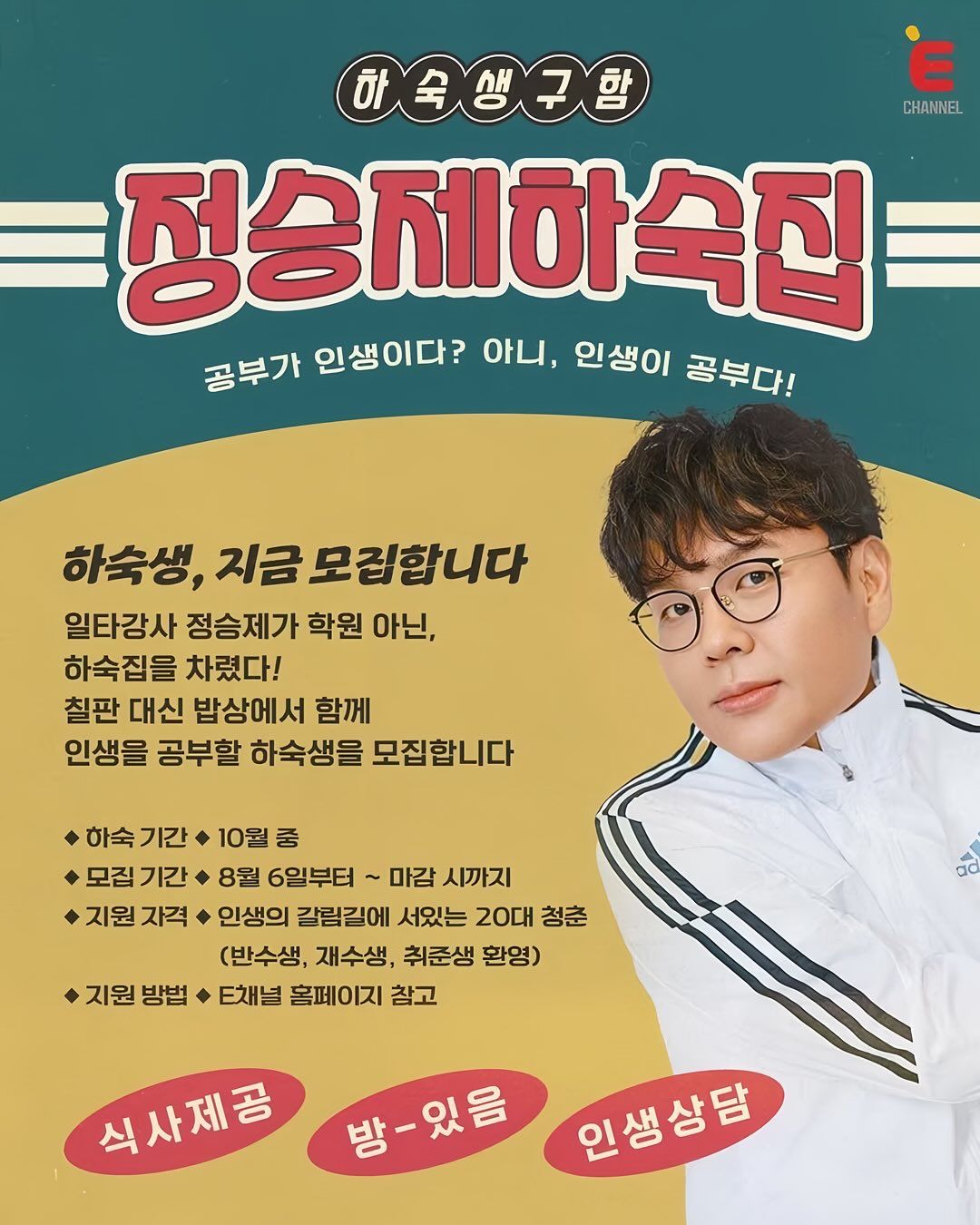 E채널 <인생 때려잡기: 정승제 하숙집>은 20대 청춘들에게 위로와 용기를 전하는 신규 예능입니다. 수학 일타강사 정승제가 하숙집 주인장으로 나서, 고민 많은 청춘들과 함께 생활하며 인생 조언을 건네는 콘셉트죠. 정승제에 이어, 방송인 정형돈과 배우 한선화가 합류해 이들이 발휘할 시너지에도 관심이 높아지고 있어요. 이에 따르면 정형돈은 대기업 출신 연예인이자 두 딸을 둔 아빠로서, 삶의 경험에서 우러난 인사이트를 제공할 예정. 한선화는 솔직 털털한 모습으로 이들에게 다가간다는군요.