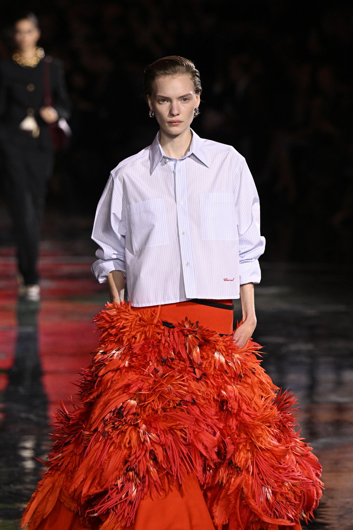 마티유 블라지가 처음 선보인 이번 시즌, 샤넬은 새로운 수장의 도약을 상징하는 듯한 커다란 행성 모티브로 뒤덮인 베뉴부터 인상적이었죠. 클래식하면서도 실험적인 방식의 손뜨개 니트웨어나, 넉넉한 실루엣의 트위드 재킷, 스트라이프 셔츠와 매치한 깃털 장식의 치마 등 샤넬의 클래식한 DNA를 새롭게 재해석했습니다.
