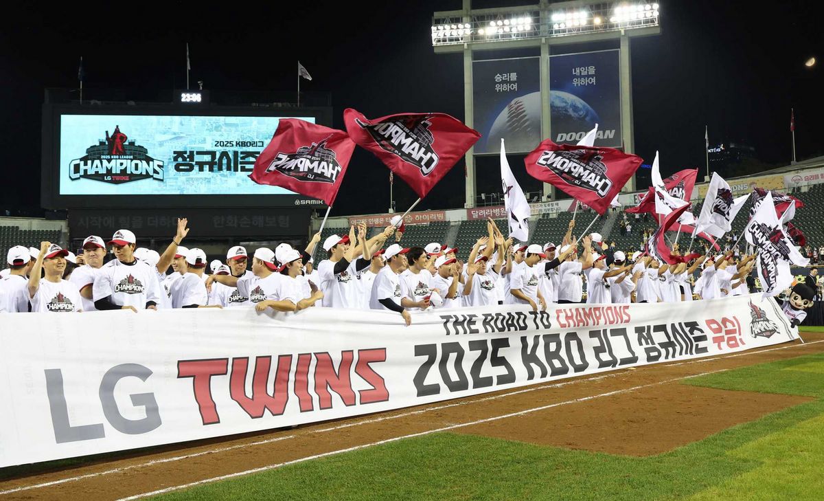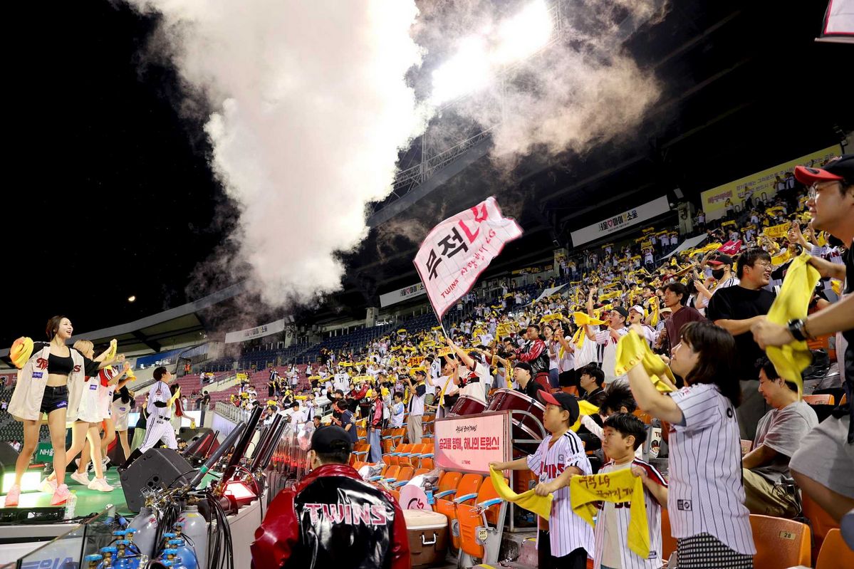 」정규시즌 우승 팀 엘지 트윈스의 상징 컬러는 스트라이프와 레드 그리고 응원단의 노란 타월 물결입니다.
