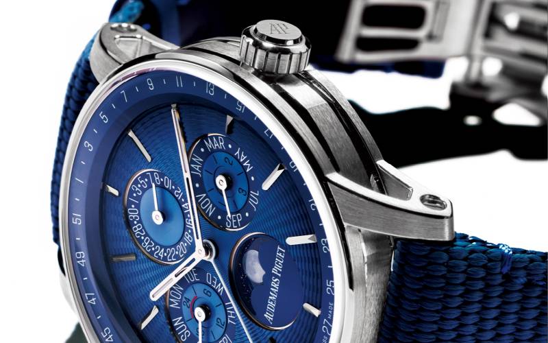 라이트 블루 PVD 그랑드 타피스리 다이얼을 결합한 38mm 퍼페추얼 캘린더 로열 오크.