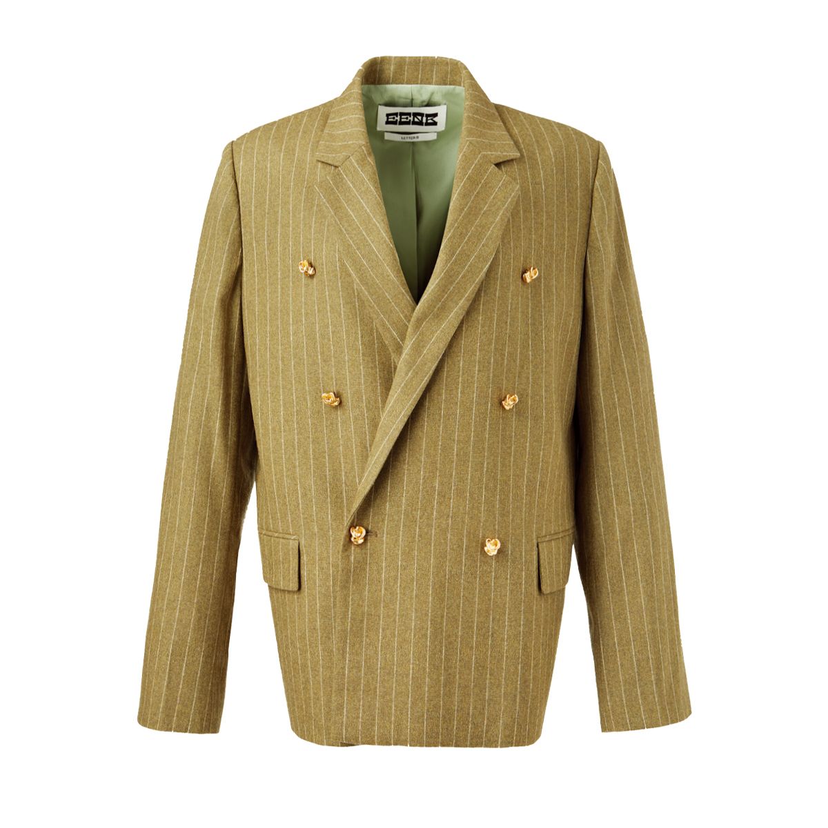 메탈 버튼 장식의 핀스트라이프 재킷은 79만8천원, Eenk.