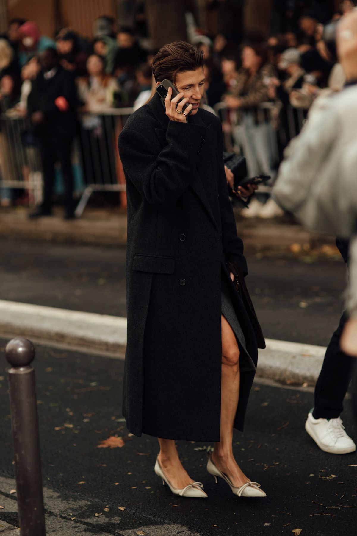 작은 단추들이 가지런히 일렬로 선 블랙 롱 코트는 클래식하지만 단번에 시선을 사로잡습니다. 미니멀리스트의 필수품인 단정한 블랙 토트백과 화이트 발레 플랫이 90년대 분위기를 은근하게 풍기죠. 심플한 블랙 코트라 할지라도 단추나 주머니 등 작은 디테일만 더해지면 충분히 볼드해질 수 있어요.