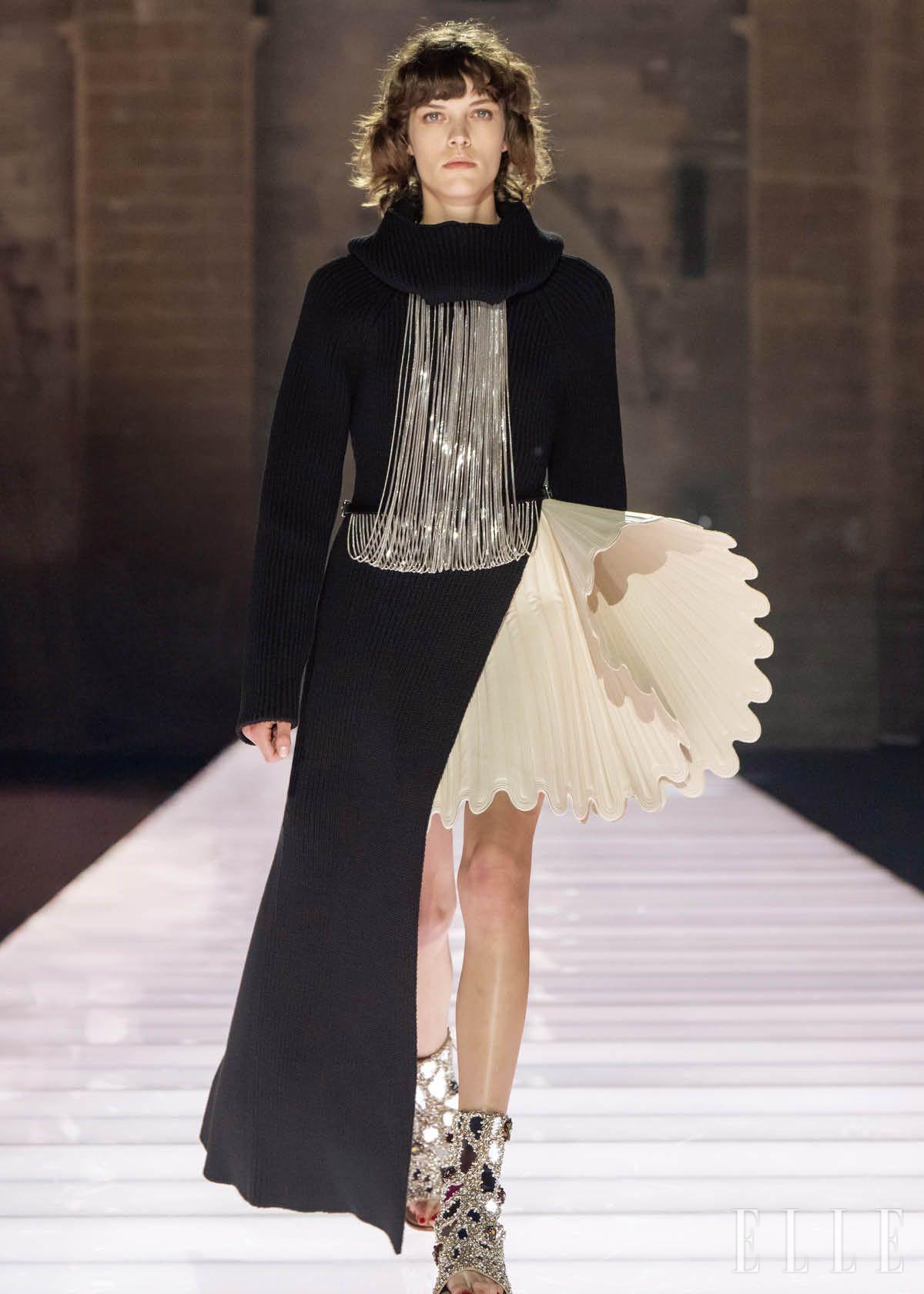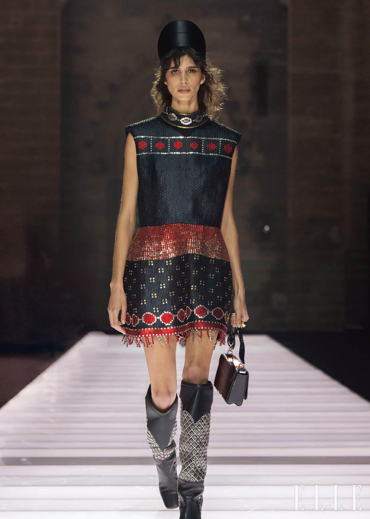 먼저 45개의 룩을 선보이는 방식은 무대 구성부터 달랐다. 객석과 무대를 뒤바꿔 관객이 무대에 앉고, 무대가 객석이 되게 한 것이다. “관객을 무대 위에 세우고 싶었어요. 공연하는 사람이 보는 시선에서 관객이 모든 걸 바라보게 하고 싶었죠.” 쇼 시작 전에 제스키에르가 말했다. ‘옛날 옛적에….’로 시작하는 디즈니 애니메이션의 도입부처럼 웅장한 음악이 흐르고 핀 조명이 비탈진 객석을 비추며 쇼가 시작됐다. 잔 다르크를 떠오르게 하는 모델은 방패가 연상되는 견고한 가죽 드레스를 입고 바람을 가르며 등장했다.