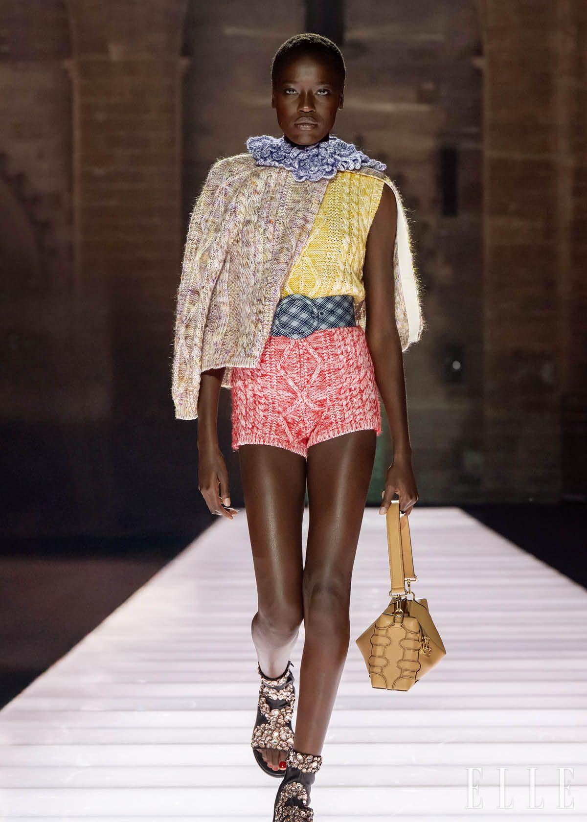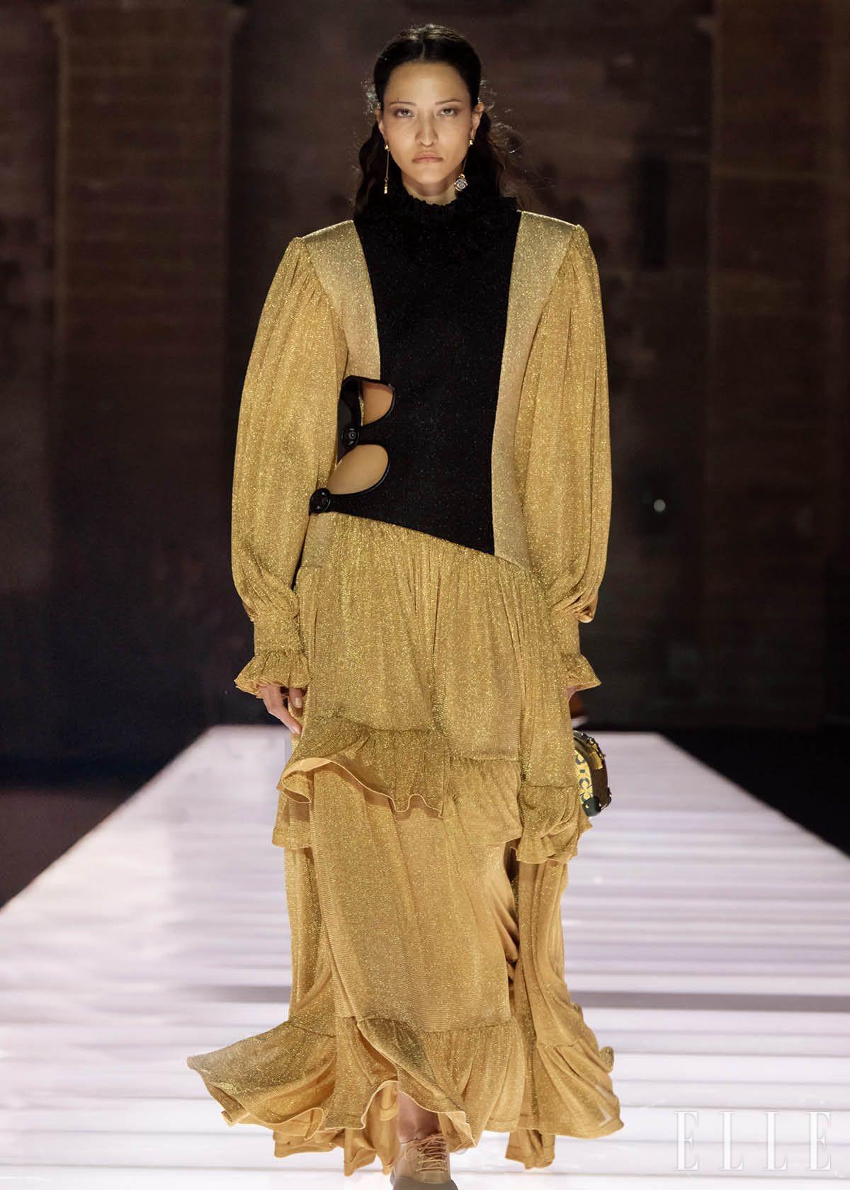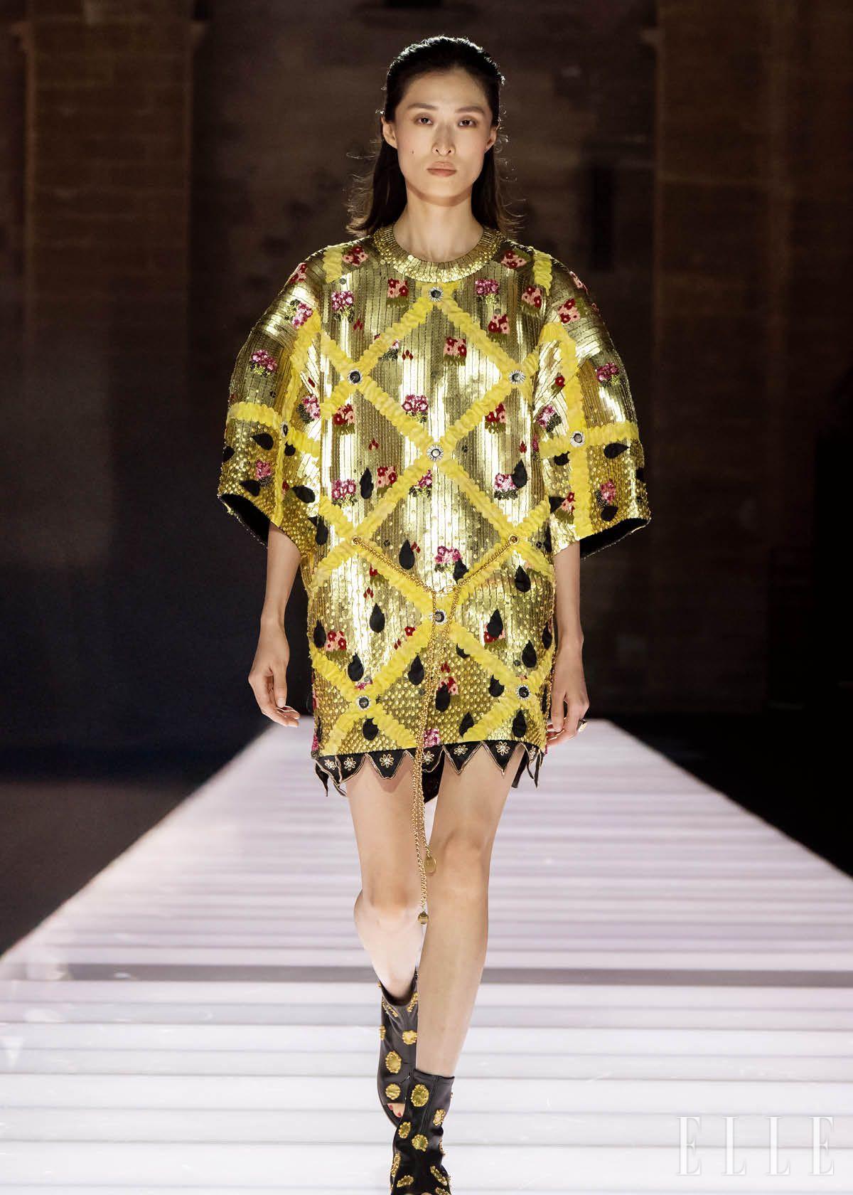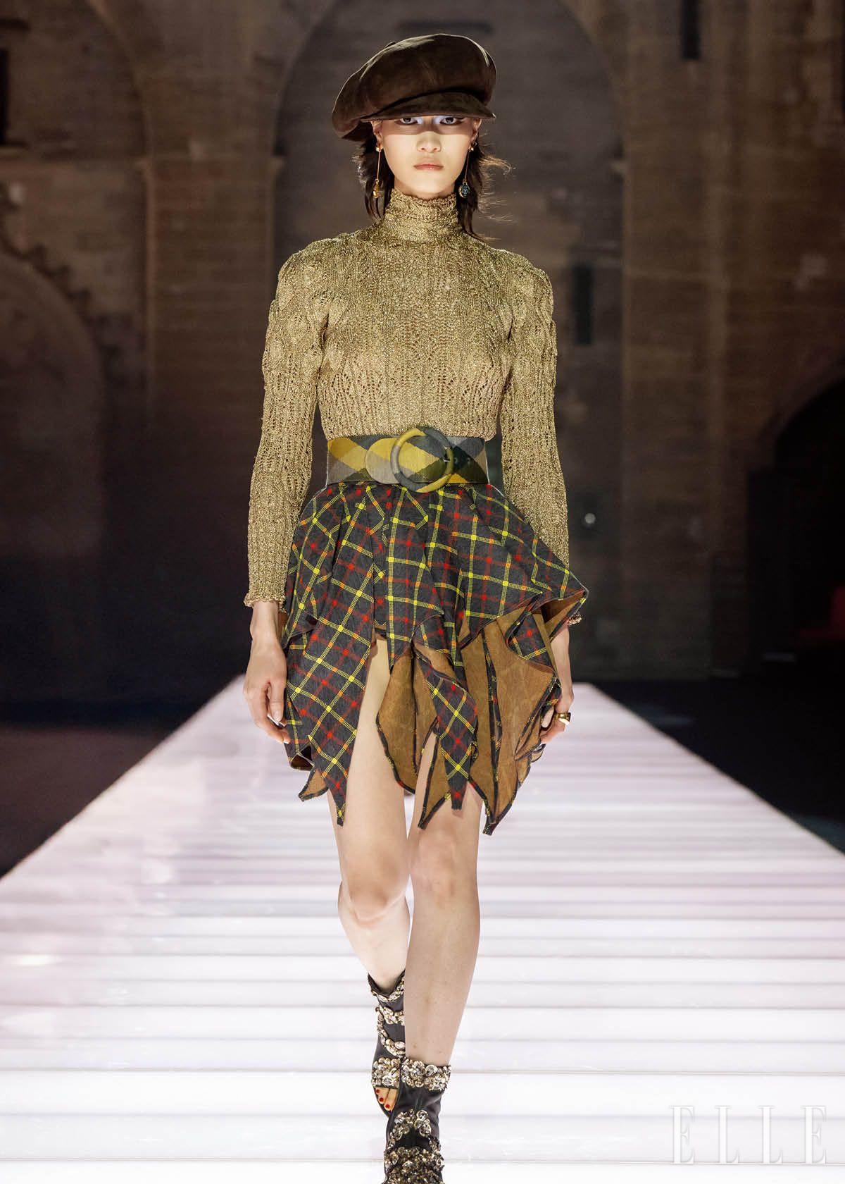 뒤이어 교황청 벽을 장식했던 정교한 문양을 재해석한 룩, 고대 종교 문서를 떠오르게 하는 패턴의 드레스가 이어졌다. 쇼의 서사는 점점 고조됐고 파워 숄더와 대비되는 러플 장식, 강렬한 패턴과는 정반대인 실키한 소재가 만난 유동적인 룩으로 제스키에르 주인공들이 런웨이를 누볐다. 시선은 자연스럽게 모델들을 따라 중앙 무대로 향했다. 한층 가까이 다가온 모델들은 투구와 왕관 같은 헤드 피스, 변색된 경첩 장식의 백, 조각난 거울이 더해진 부츠 등 작지만 강렬한 액세서리로 자신이 맡은 역할을 적극적으로 표현했다.