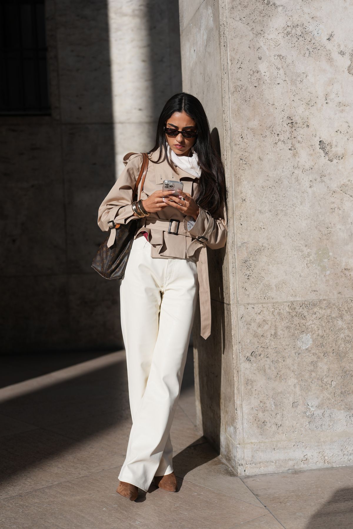 가을 하면 떠오르는 소재, 바로 스웨이드입니다. 이번 시즌 미우미우와 더 로우 컬렉션에서도 스웨이드 아이템이 대거 등장한 바 있죠. 따뜻한 소재감이 도드라지는 스웨이드를 크림색 시가렛 진과 매치해보세요. 두 소재의 텍스처 대비가 의외의 조화를 만들어내며, 가을 특유의 따뜻한 무드를 더해줄 테니까요. 특히 크림 톤의 데님은 화이트보다 부드럽고, 베이지보다 밝아 어떤 상의 컬러와도 잘 어울리죠. 크롭 기장의 트렌치코트에 스웨이드 백을 함께 매치하면 룩 전체가 부드럽고 감각적으로 정리됩니다. 지나치게 꾸미지 않았지만, 보는 이로 하여금 센스 있다는 인상을 주는 완벽한 가을 룩이죠.