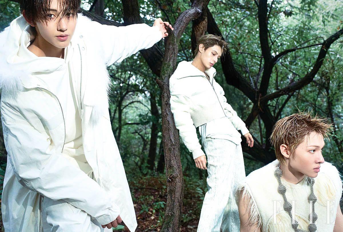제임스가 입은 톱은 Courrèges. 건호가 입은 재킷은 Takahiromiyashita the Soloist. 마틴이 입은 레더 톱은 Saint Laurent by Anthony Vaccarello.