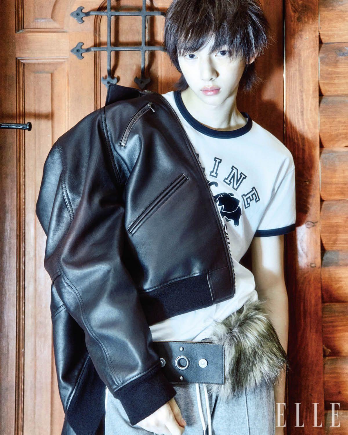 레더 블루종, 링거 티셔츠는 모두 Celine.