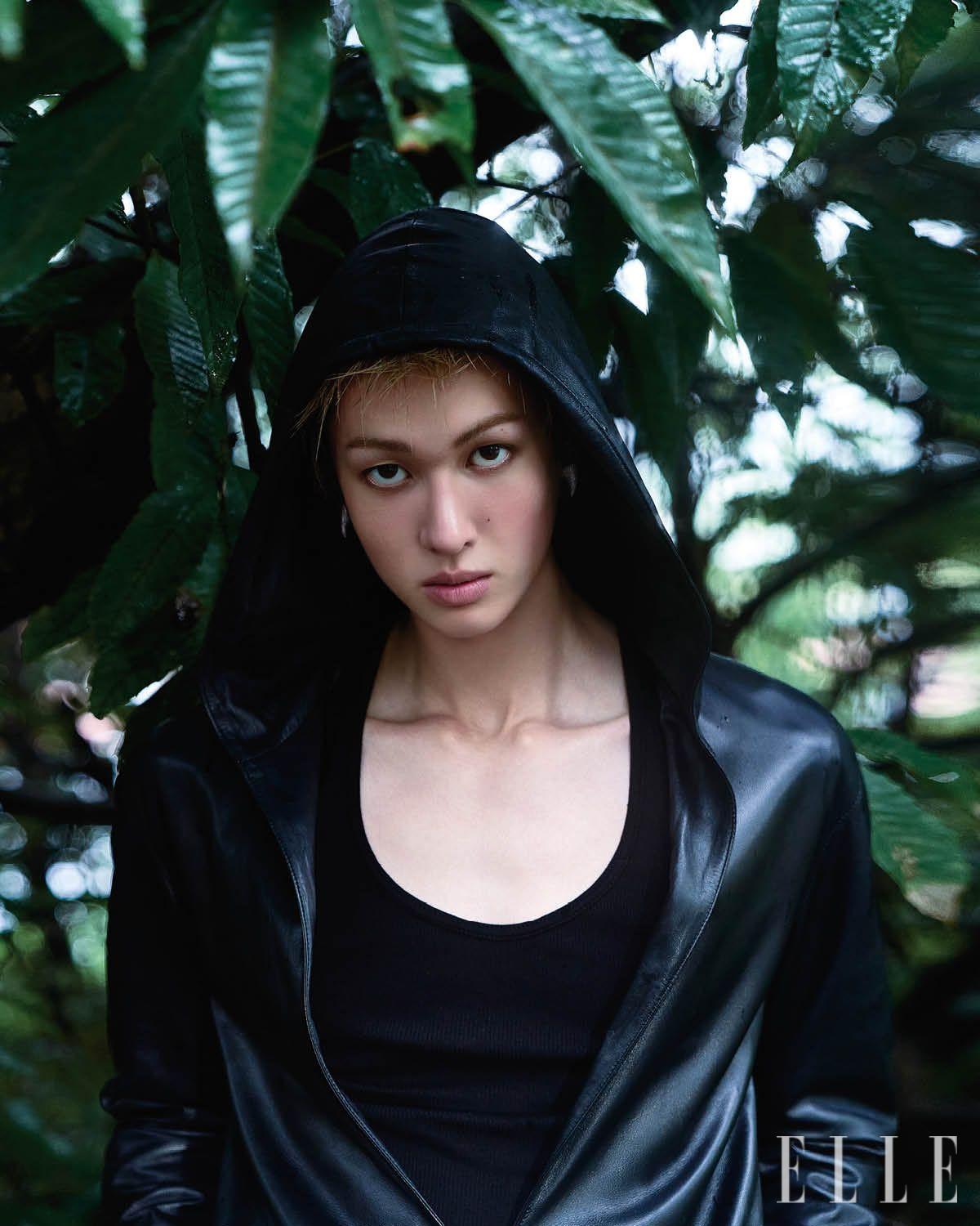 레더 롱 후디드 톱은 Saint Laurent by Anthony Vaccarello. 이너 웨어 톱은 Supreme. 이어링은 스타일리스트 소장품.